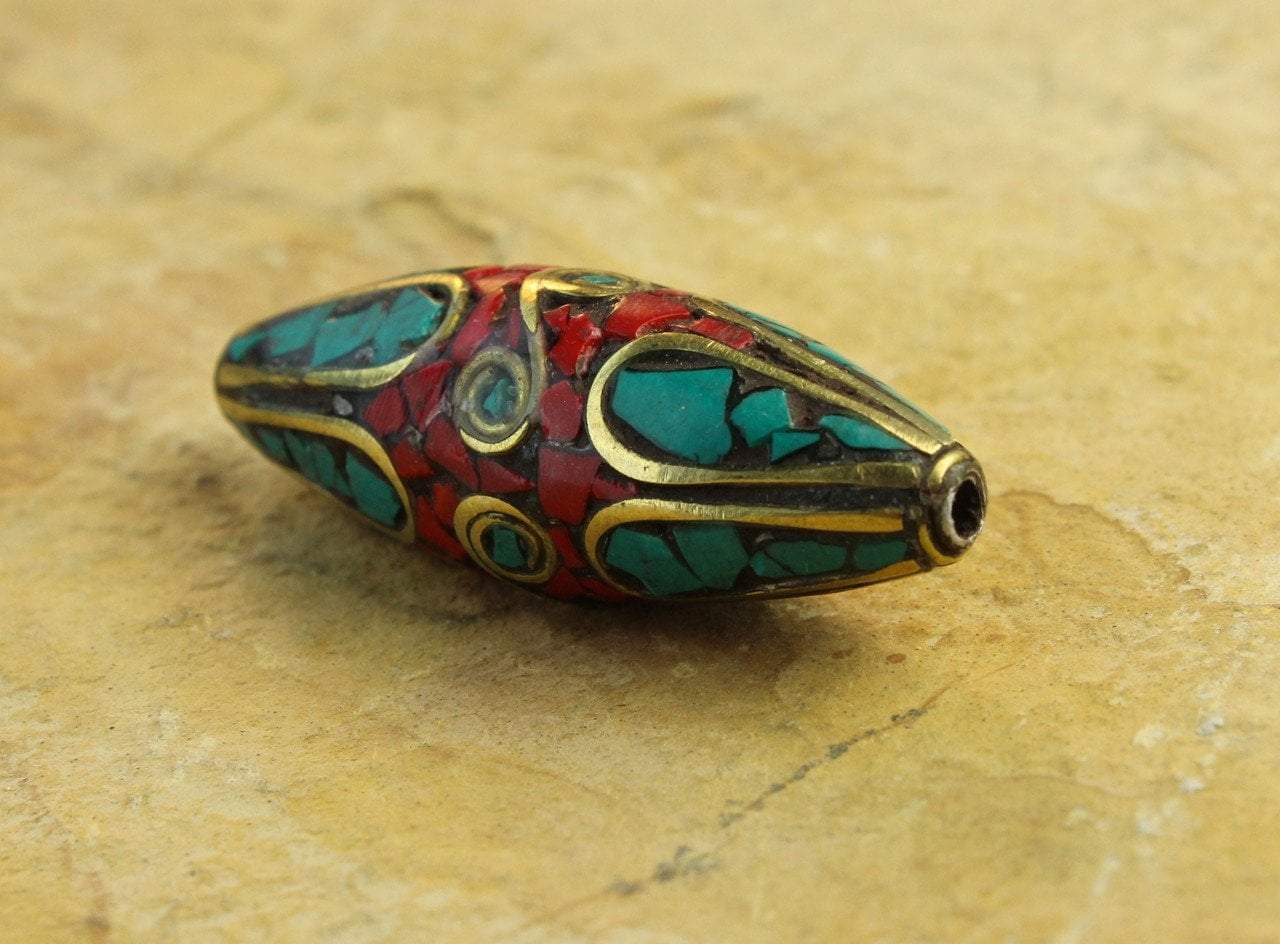 A large, traditional Tibetan bead with brass and inlaid turquoise and coral. Would be a nice addition to any mala, bracelet or necklace.