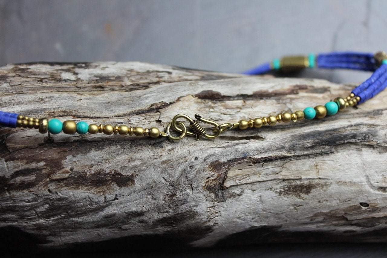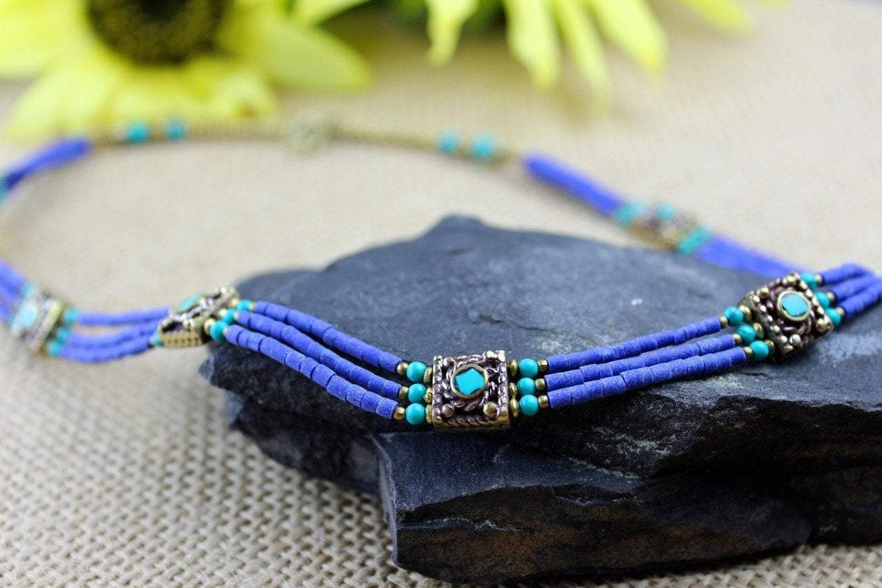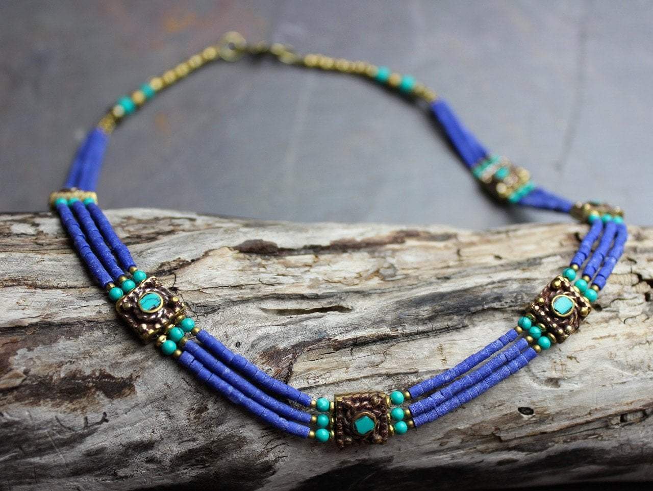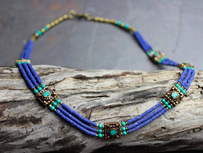 A stunning Tibetan necklace handmade by Karma Dolma in Kathmandu. Strands of lapis, turquoise, and brass beads conneced with a S closure.