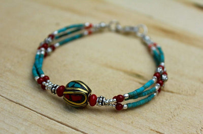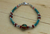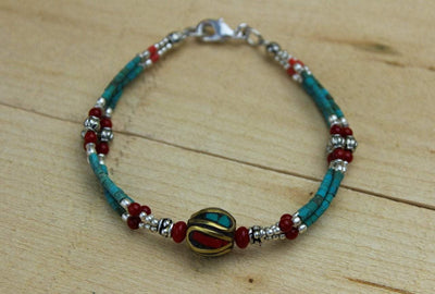 These popular bracelets are back! Turquoise, coral and brass beads with a traditional focal bead.