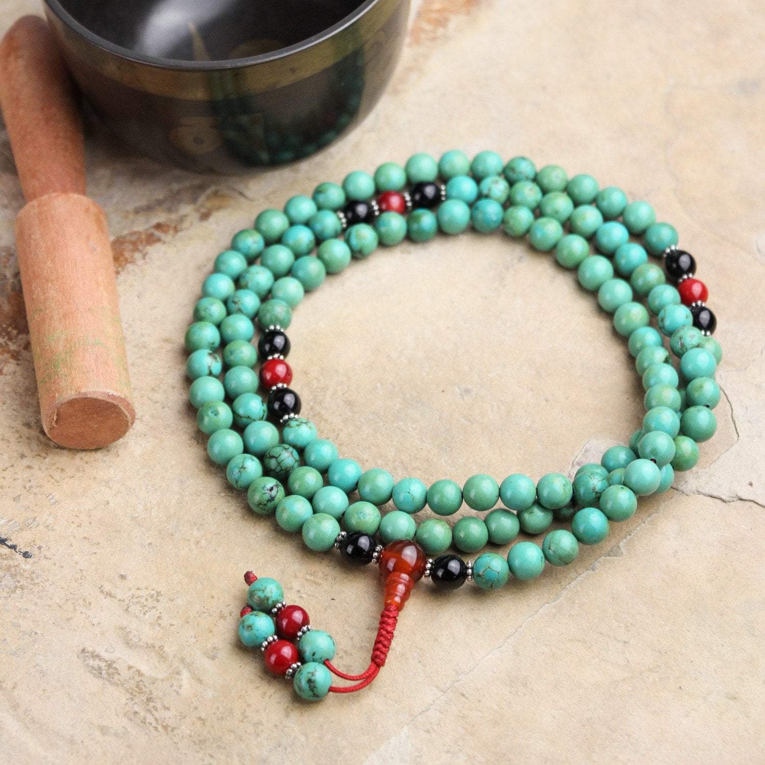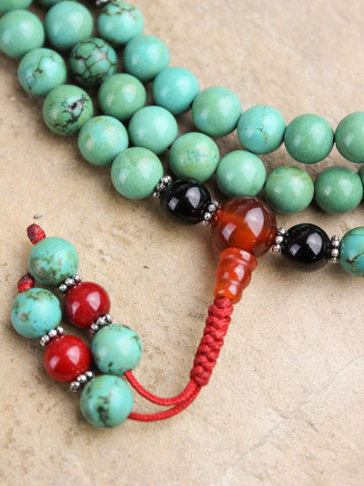 Absolutely gorgeous 108 bead mala that features Tibetan turquoise beads, coral and onyx spacers, and is finished with a carnelian guru bead. Strung slightly loosely, it is truly a beautiful mala that is great for meditation!