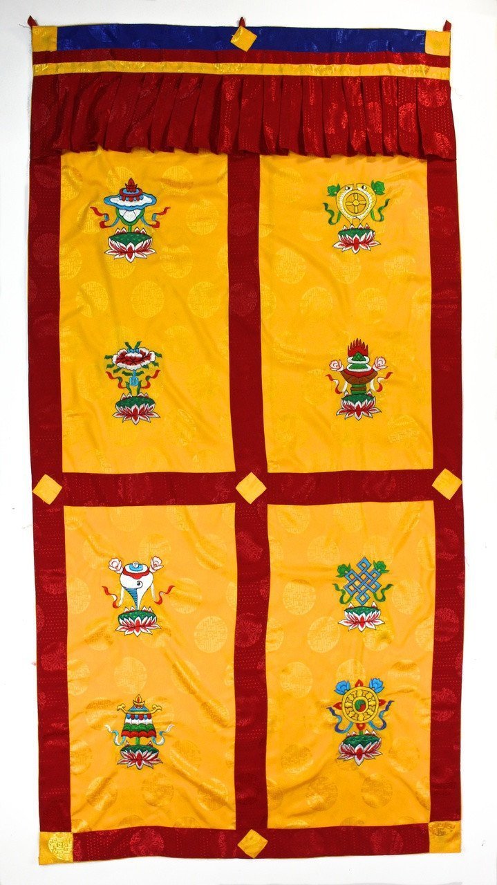 The people in Nepal use door curtains like these to keep the cool mountain air out. It is a beautiful way to decorate your home. Bright yellow background with embroidered traditional symbols hand sewn on the front. Bright red ruffle at the top and includes three hooks for easy hanging. Handmade in Nepal.