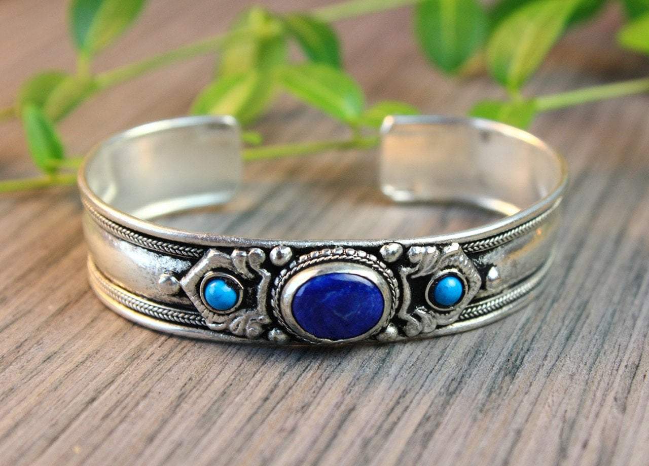 Traditional Tibetan style bracelet with lapis stone and silver plated metal.