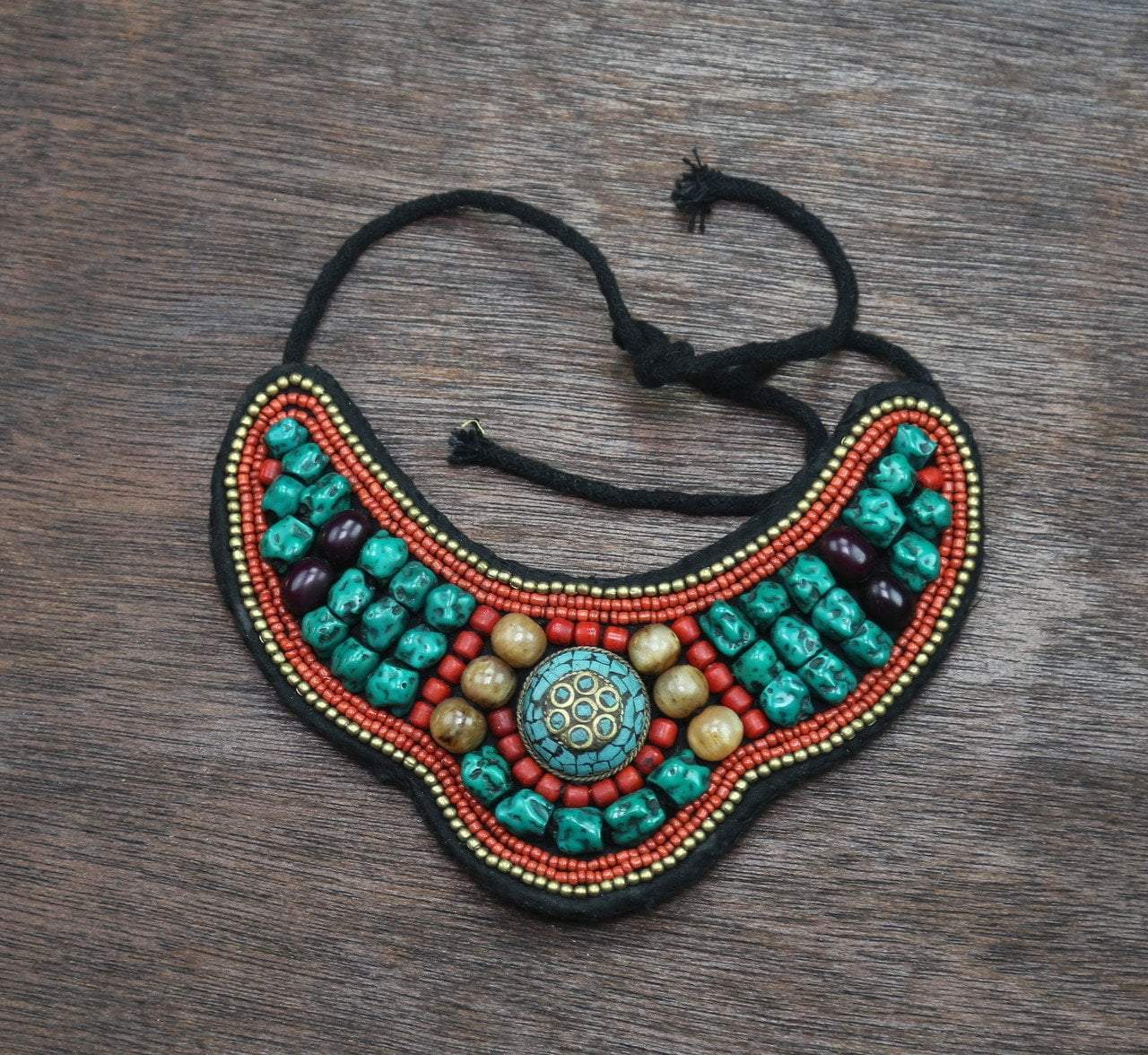 These traditional necklaces are making a comeback in Tibetan communities around the world. Ancient versions of these necklaces had thousands of dollars worth of trade beads, our modern version is all hand made in Nepal with faux coral beads and pressed tourquoisewith copal amber. One of a kind