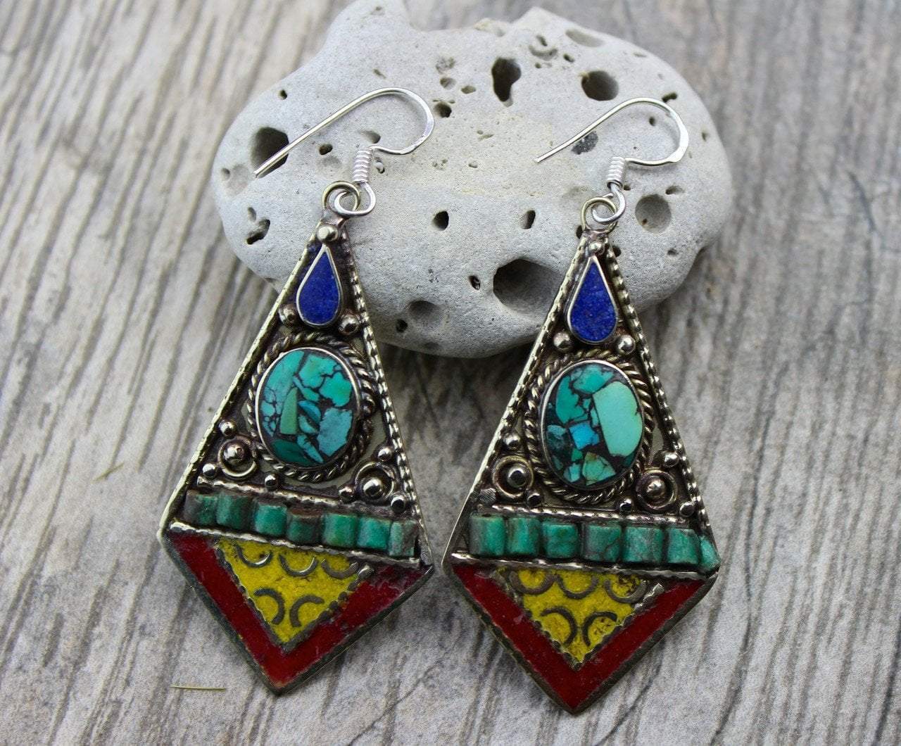 Traditional Tibetan Design. Inlaid stones of turquoise, amber, lapis and coral. Sterling silver french hooks.
