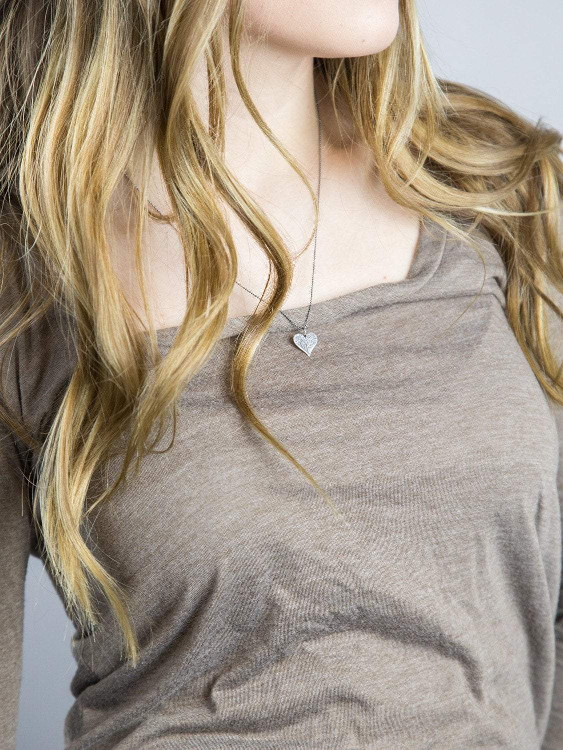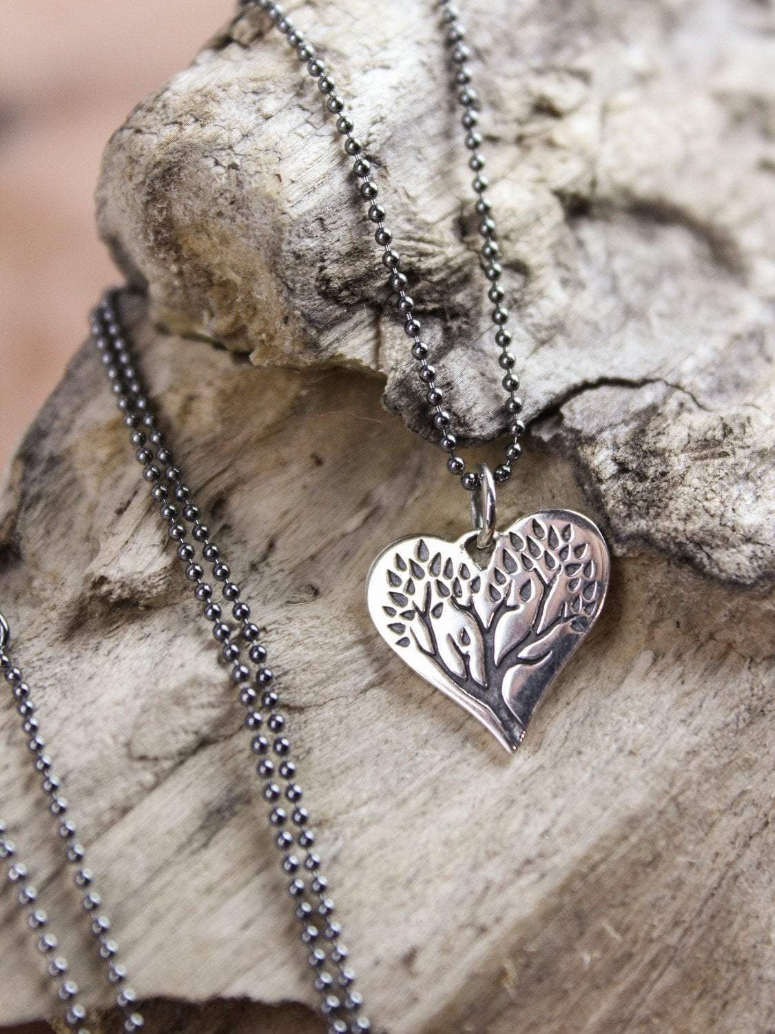 This tiny Dharma necklace features a sterling silver heart charm with an elegant Tree of Life stamped design on a petite ball chain. The Tree of Life symbolizes many things including wisdom, protection, strength, bounty, beauty, and redemption. This dainty necklace pairs well with casual or formal outfits, and is great for everyday wear.