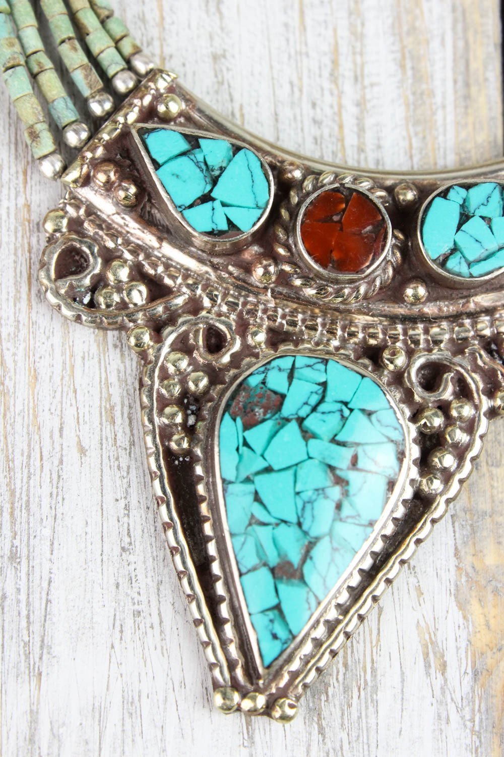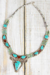 Tibetan women have always worn statement pieces, and this necklace is no exception!  With coral and turquoise inlaid in silver, this bib style necklace is simply divine.  Turquoise beads on five strands of silver wire are connected with larger pieces of stone inlaid silver.  The center teardrop stone is unique, as it features small chunks of coral within the inlaid turquoise.  This necklace is the only one of its kind left; get it while you can!!!