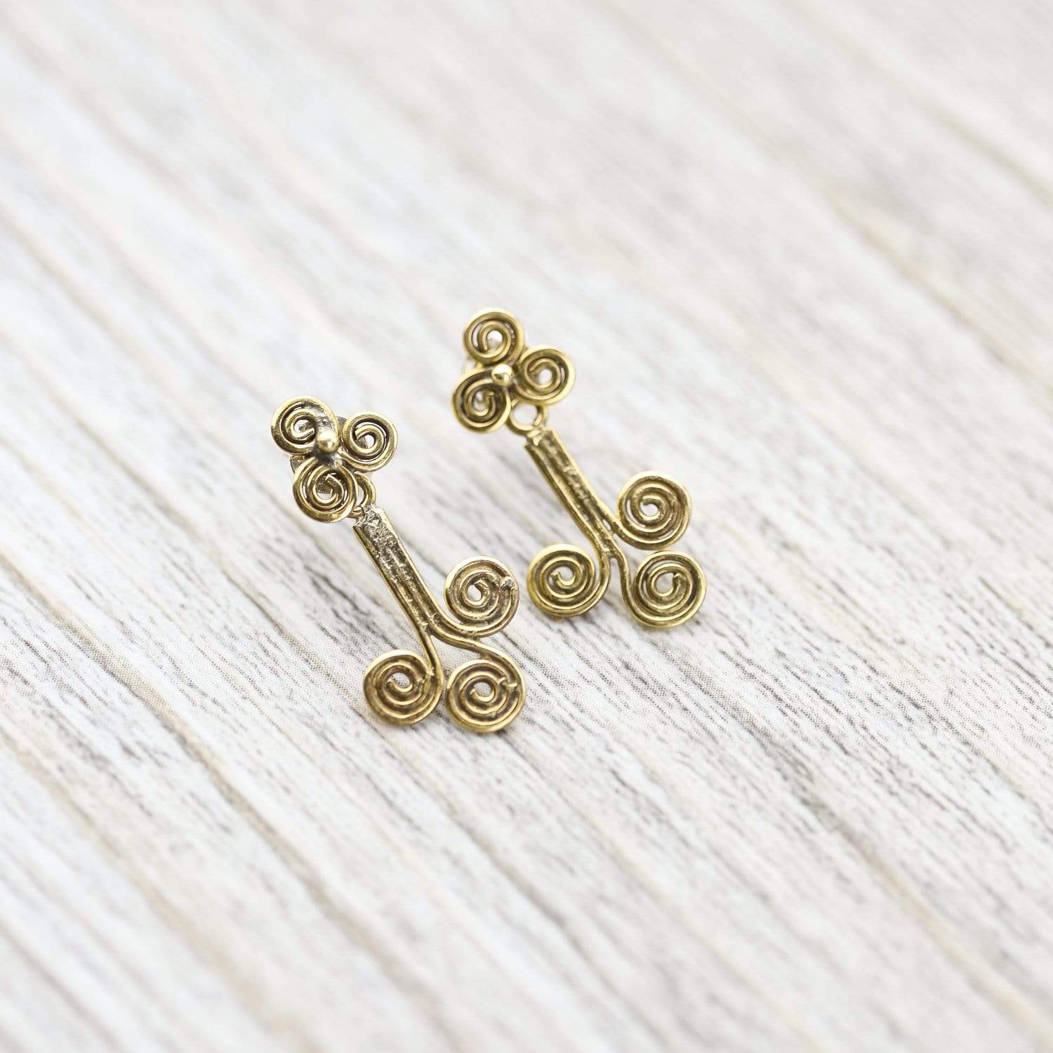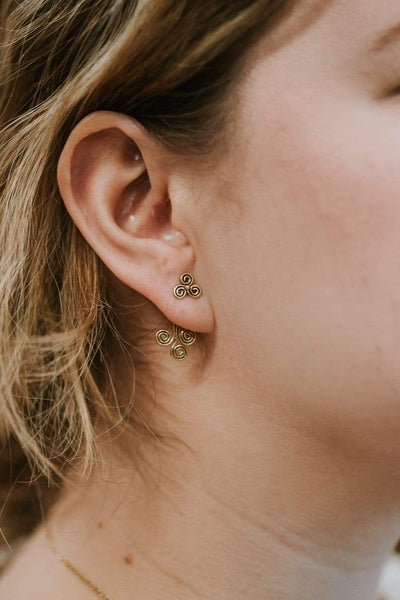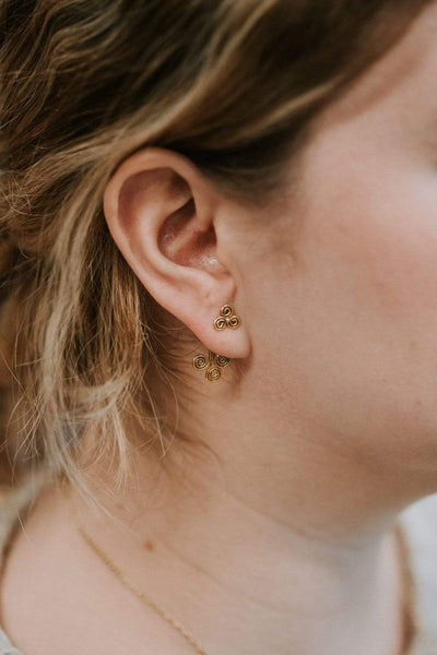 These earrings feature a unique and modern huggie-style design, meaning that it will "hug" the earlobe both in front and behind. As you can see in the photos, the earring can come apart so that you may put the post of the earring through the front of the lobe while attaching the dangle piece behind and securing it with the earring back. This leaves you with a stylish and trendy new look!