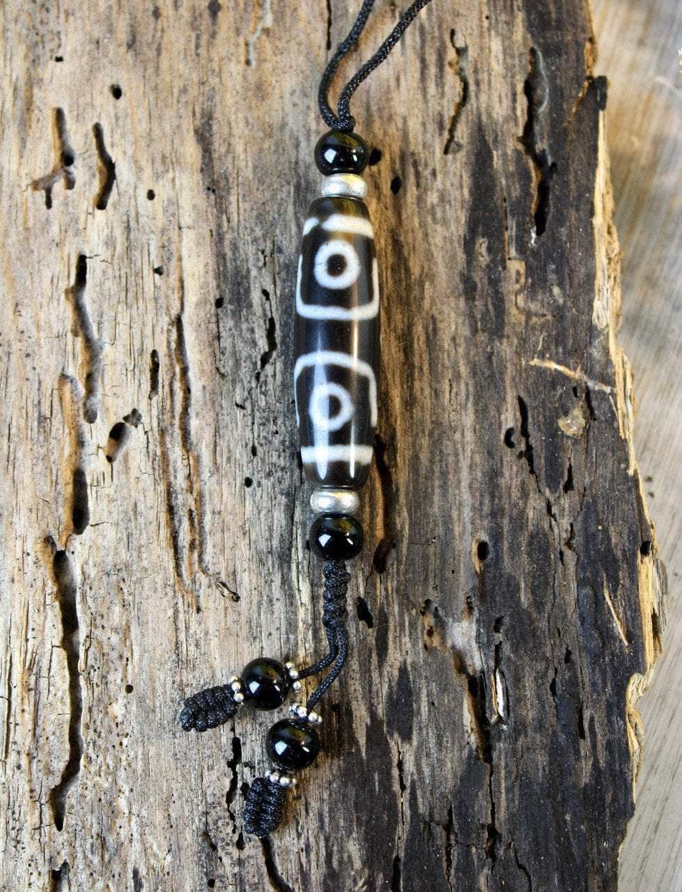 This three eyed Dzi bead is hung vertically on black cord. The light banding underneath the perfect design, allows the natural agate to shine through. Sliding knots adjust cording for a long or short necklace.