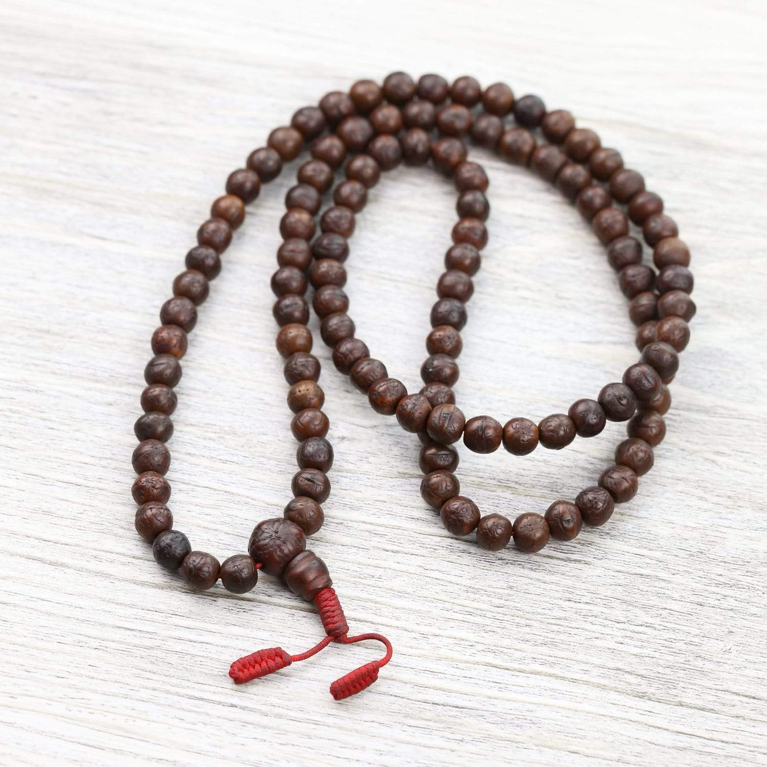 • Made of 108 small, well used dark bodhi beads.  Each bead is rich in color, quite dark with a beautiful sheen and texture.  These antique beads have been restrung in the last couple of years on monks robe red cord.