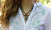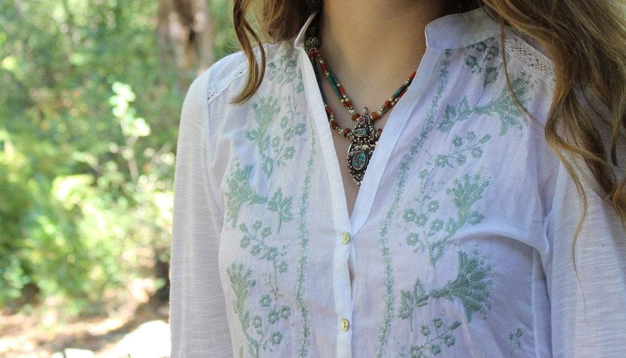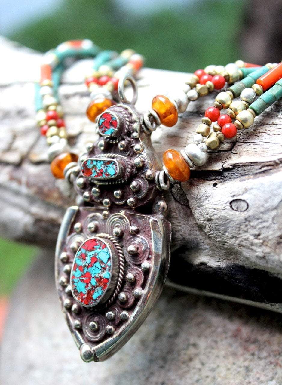Beautiful, exquisite piece made by the hand of Karma Dolma.  This necklace features strands of coral and turquoise beads accented with amber stones leading to a focal hand inlaid silver plated brass piece.