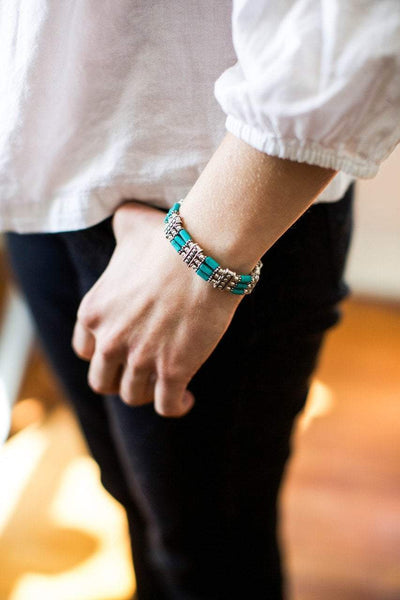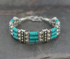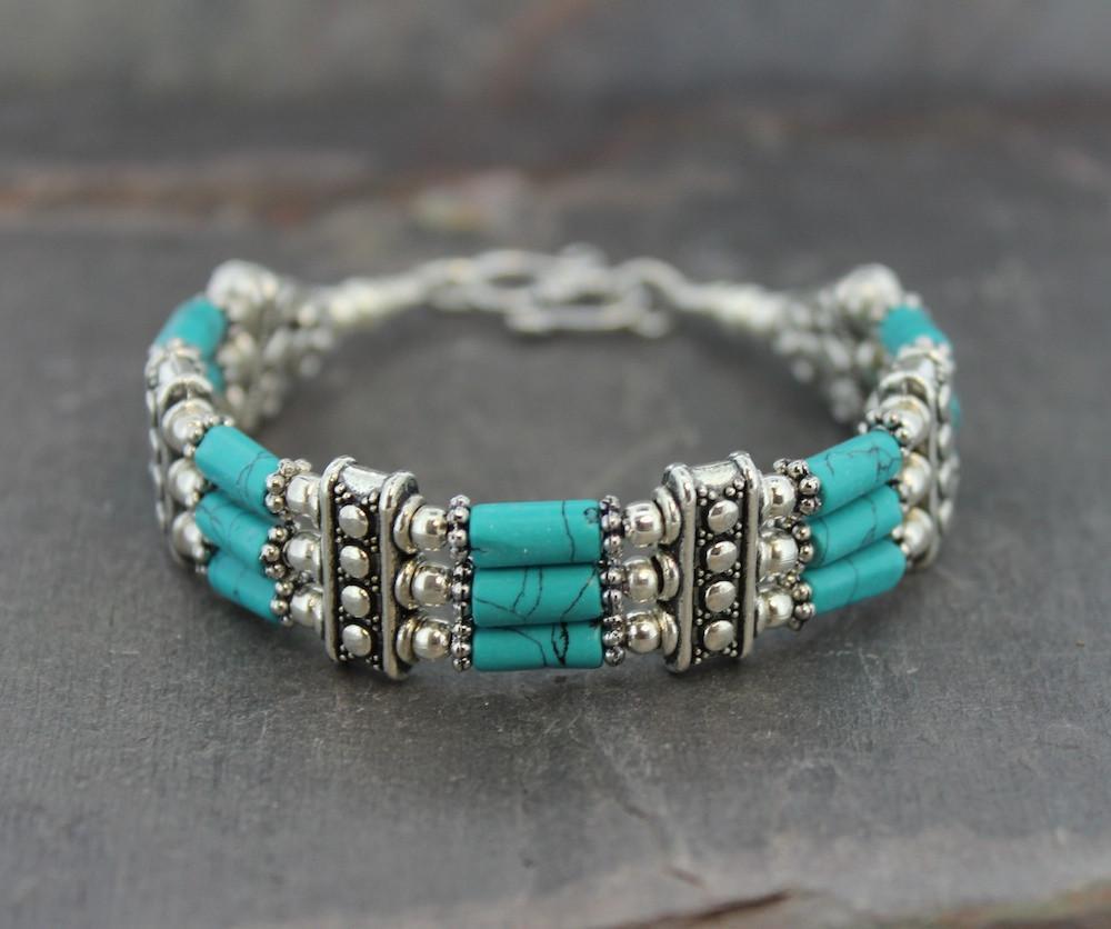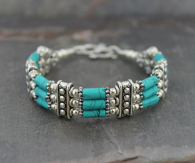 Special band-shaped turquoise beads trail along this eye-catching bracelet. Silver plated. S-hook closure. Made in Nepal.