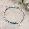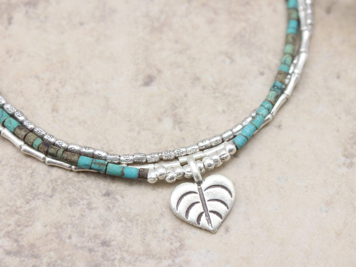 This dainty and elegant multi-strand bracelet looks gorgeous on its own or worn in a stack of your favorite bracelets!  Made with two strands of 98% pure Hill Tribe silver and one strand of beautiful Afghani turquoise.  Features a silver toggle clasp closure and heart-shaped leaf charm.