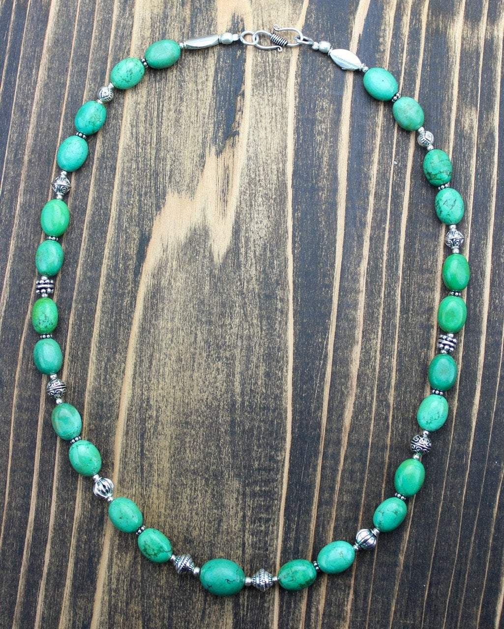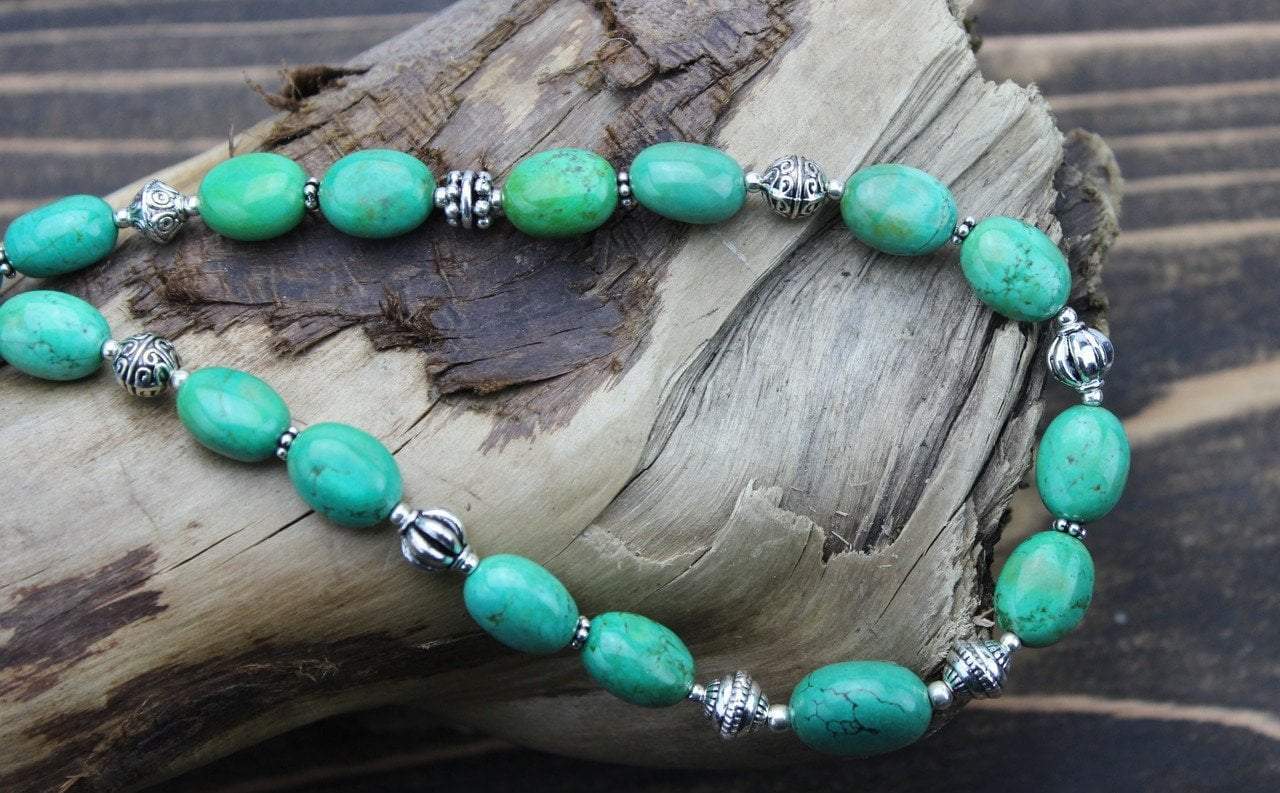 This classic and simple turquoise bead necklace features a variety of pewter and silver spacers.