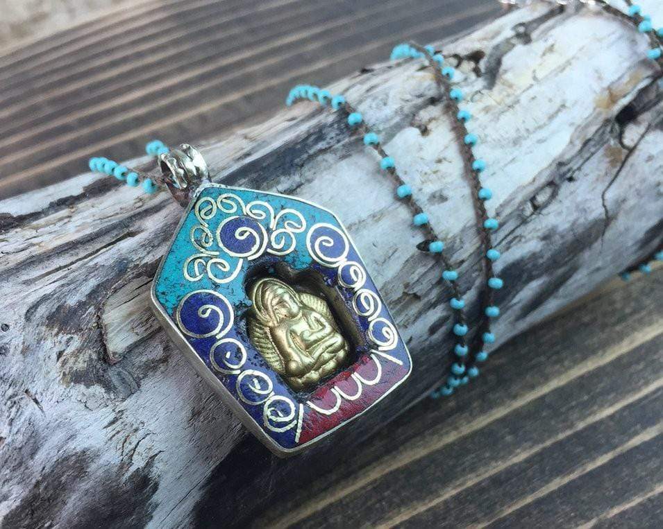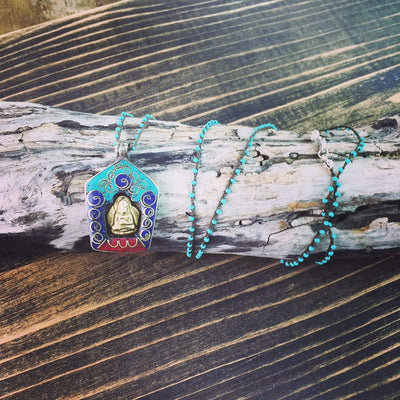 Our incredible Buddha altar pendant is strung on our popular turquoise hand braided brown chain. The pendant also features inlaid turquoise, lapis, and coral pieces.