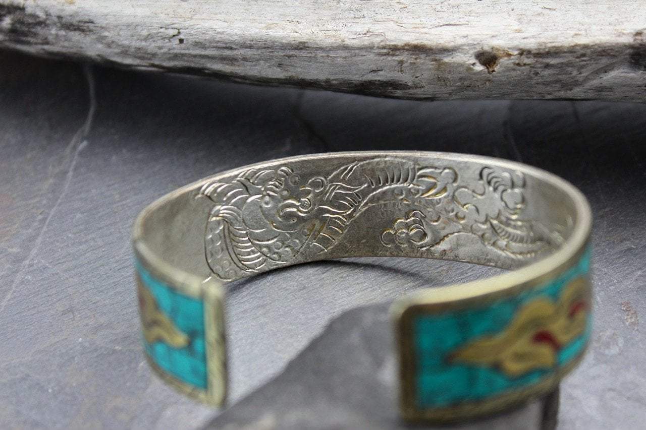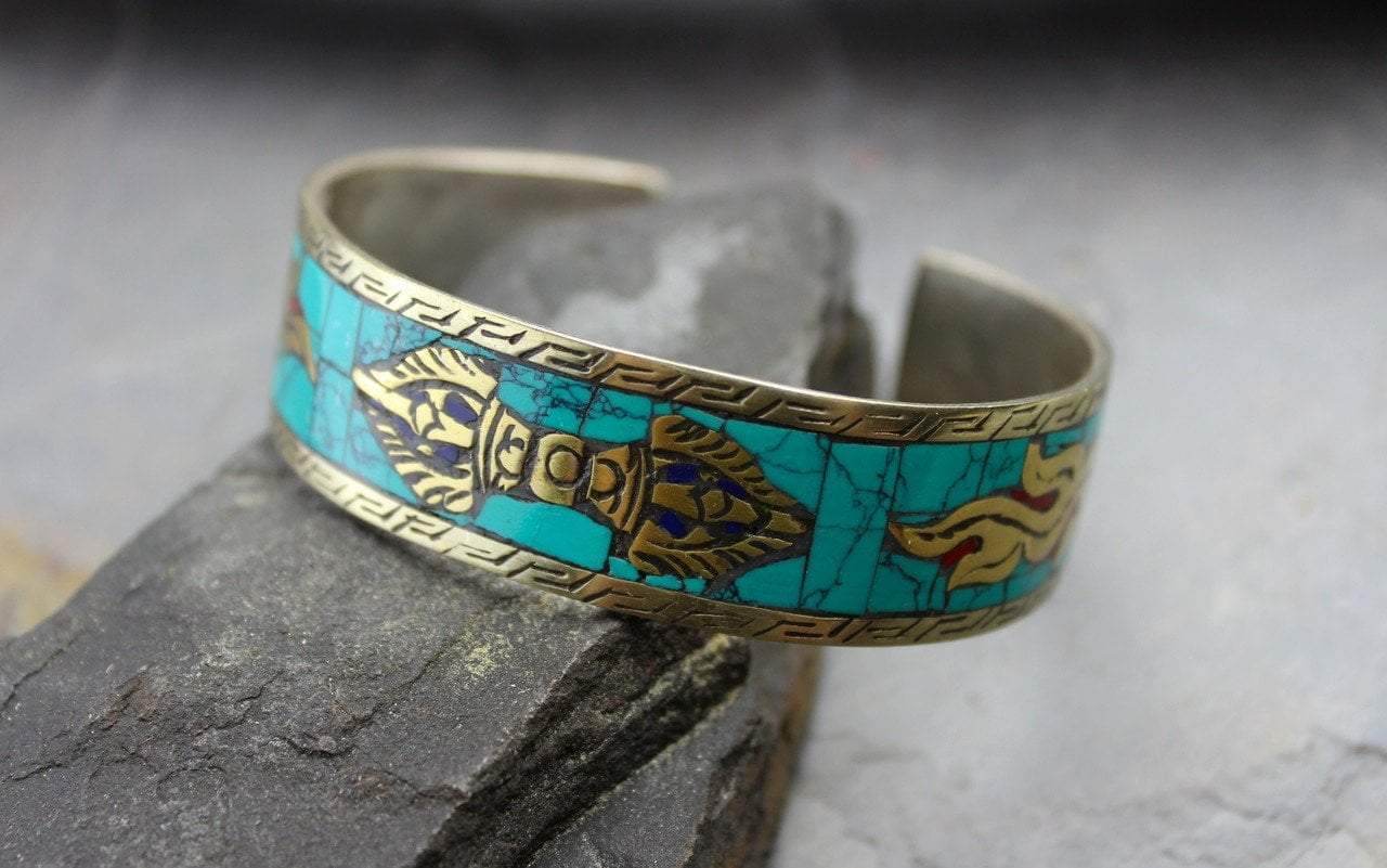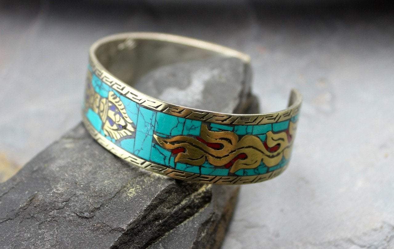 This is a new design for our bracelet collection and this slip on bracelet is really beatifully made. Hand carved in silver plated brass, the bracelet is then inlaid with lapis, coral and turquoise tiles to create a mosaic look.
