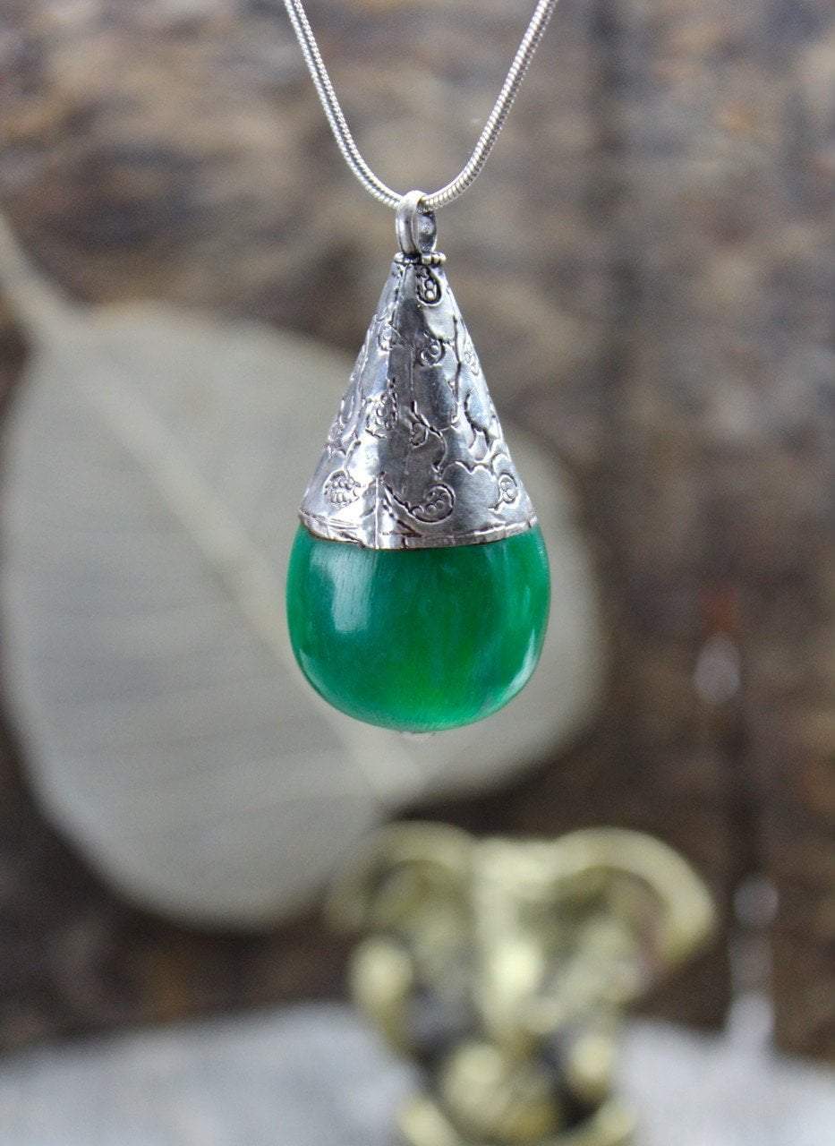 Traditional pendant with turquoise resin and a hand etched white metal cap.