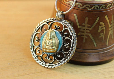 Reversable Medicine Buddha brass and turquoise pendant. Brass Medicine Buddha inlaid in turquoise stone. Design in brass encompasses Buddha.