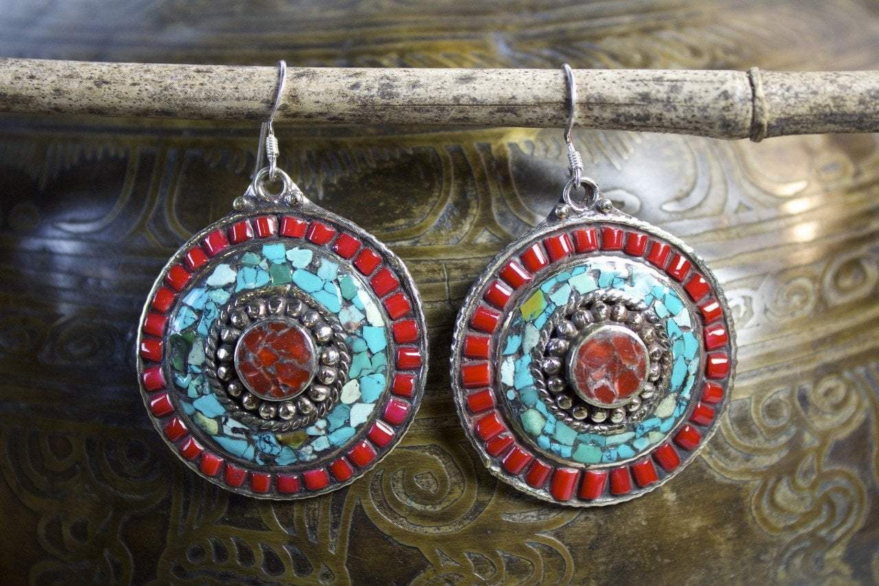 Large and traditionally designed, silver plated, hand-inlaid turquoise and coral earrings with sterling silver french hooks make a bold statement!  Hand made in Nepal.