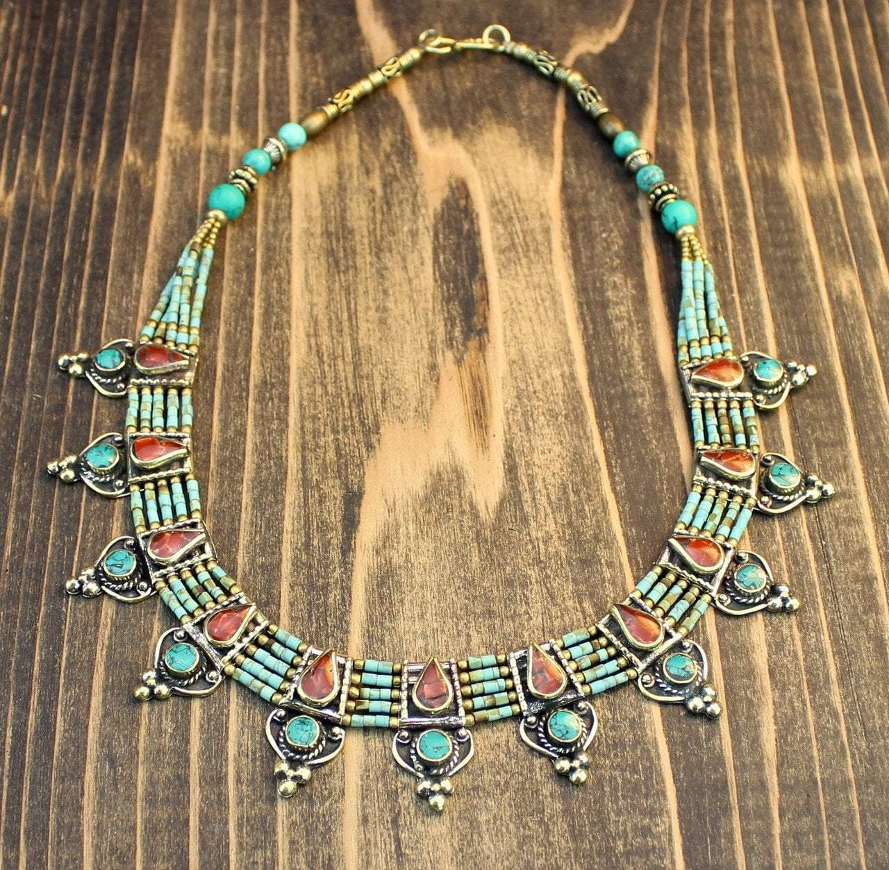 A truly gorgeous statement necklace. Handmade in Nepal, this combination of gold brass, turquoise, and coral makes it the perfect accessory.