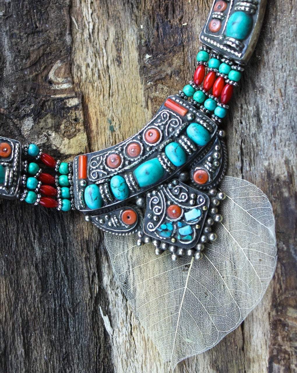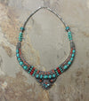 Tibetan necklace handmade by Karma Dolma in Kathmandu. Turquoise and coral beads set in Tibetan silver setting.