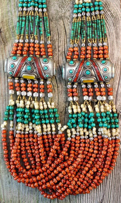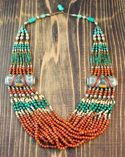 This necklace is a beautifully thought out piece of artwork. This necklace actually sits twisted around your neck; giving it a 'twisted' look. This allows for a brilliant showcasing of coral, brass, hill tribe silver, turquoise and quartz to be seen. Two pieces of silver plated brass with coral, turquoise, and amber beads are on either side of the necklace. Button with chuck of turquoise for closure.