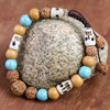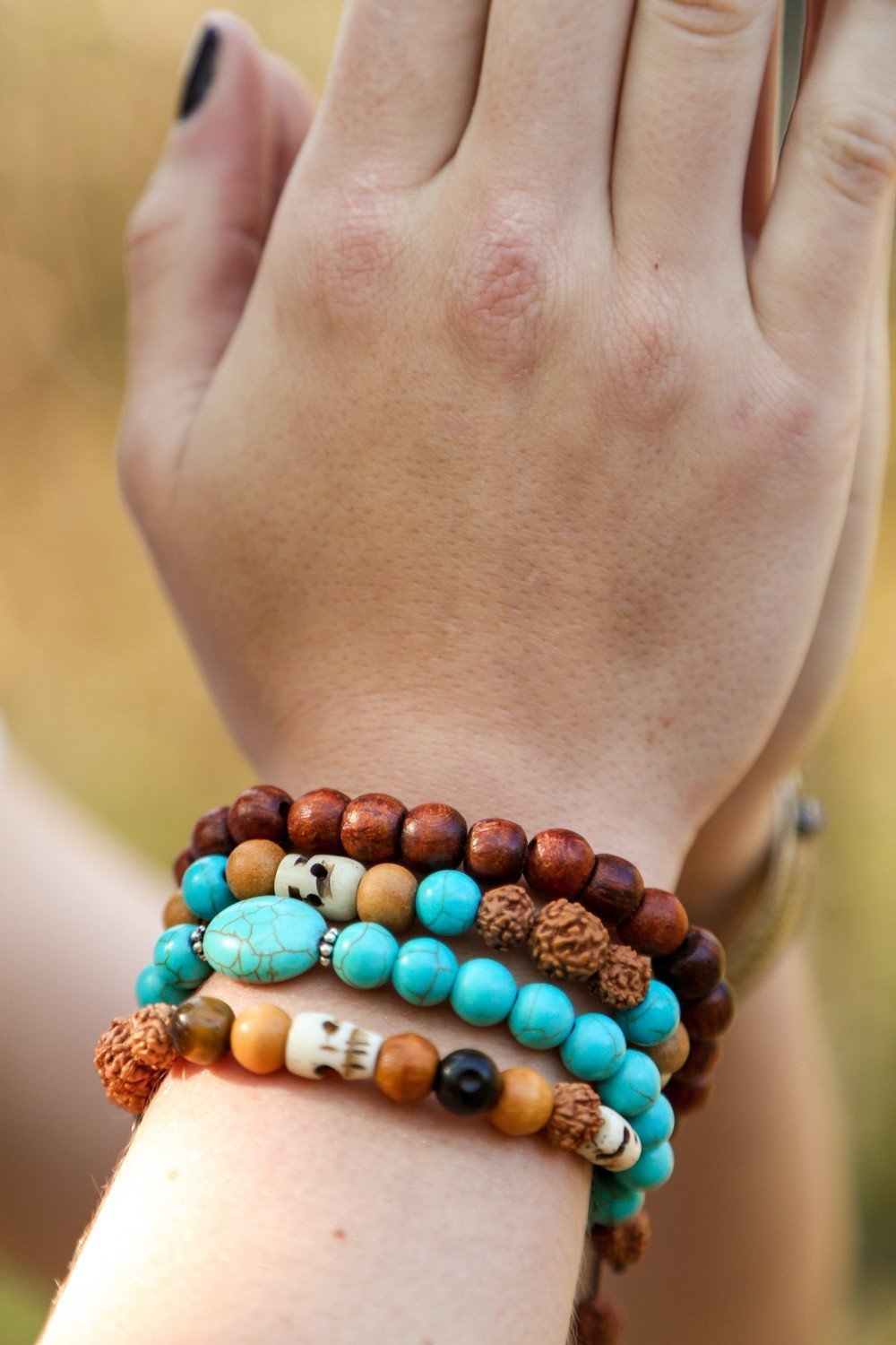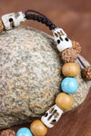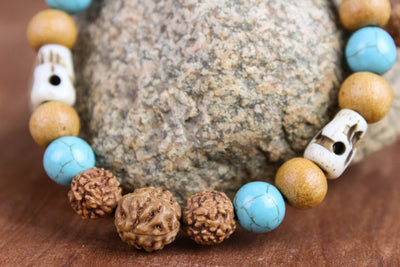 Our new handmade bracelets from Kathmandu features rudraksha beads mixed with pressed turquoise, natural wooden beads, as well as hand carved bone skulls. This bracelet is an amazing way to reflect on impermanence in your daily practice. They are a powerful reminder to be here now!