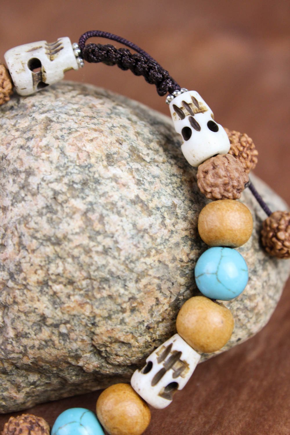 Beads are 8mm with one single 10mm rudraksha and 4 skull bone beads. Bracelet is adjustable, but runs small. Measures approximately 6 inches when fully tightened, and can open up to 8 inches.