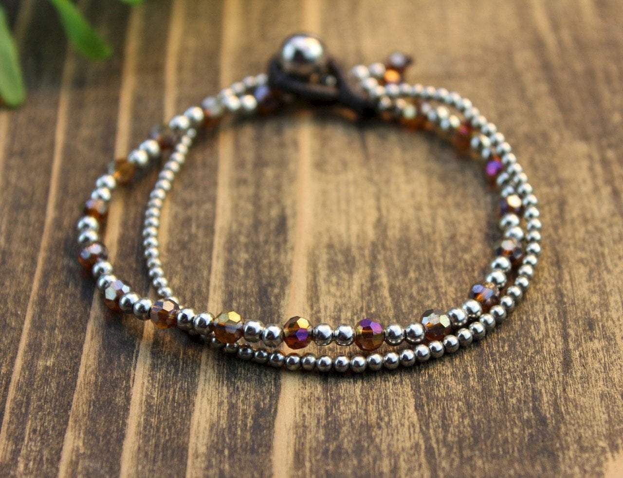 Two strands of beads that were hand made in Nepal. Light brown Czech beads and silver plated brass beads were strung on dark brown cord. Bell for closure.