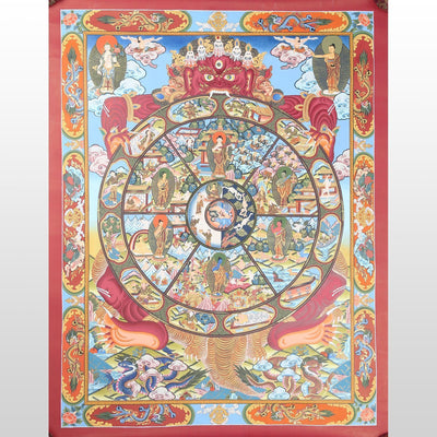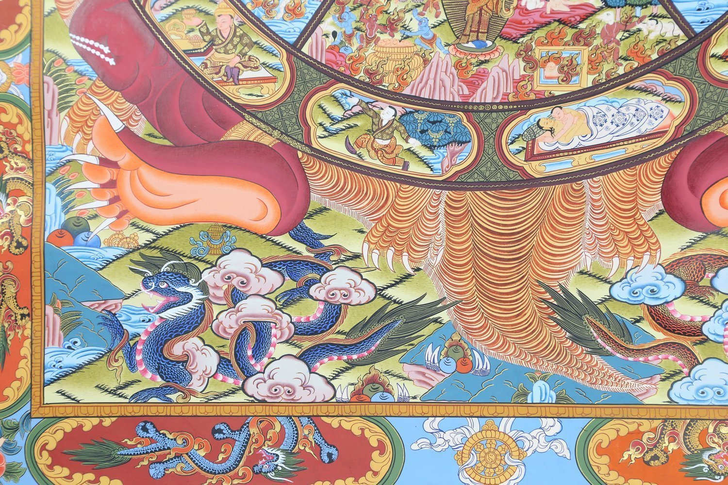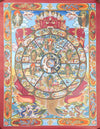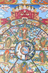 The thangka depicts a beautifully detailed Wheel of Life design and is unframed and ready for Western style framing.  It is done entirely by hand on cotton canvas using natural mineral and vegetable pigments with 24K gold details.  The complicated designs, intricate brushstrokes, and extraordinary detail make these thangkas genuine works of art.