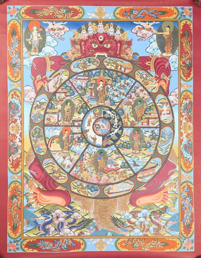 The Wheel of Life is a symbolic representation of samsara and cycle of existence.  It can be found on the outside walls of many Buddhist monasteries and temples to help people understand Buddhist teachings.  The fearsome figure holding the wheel represents impermanence.