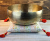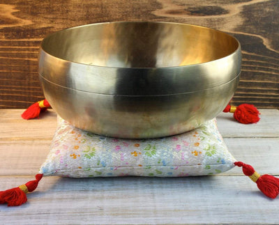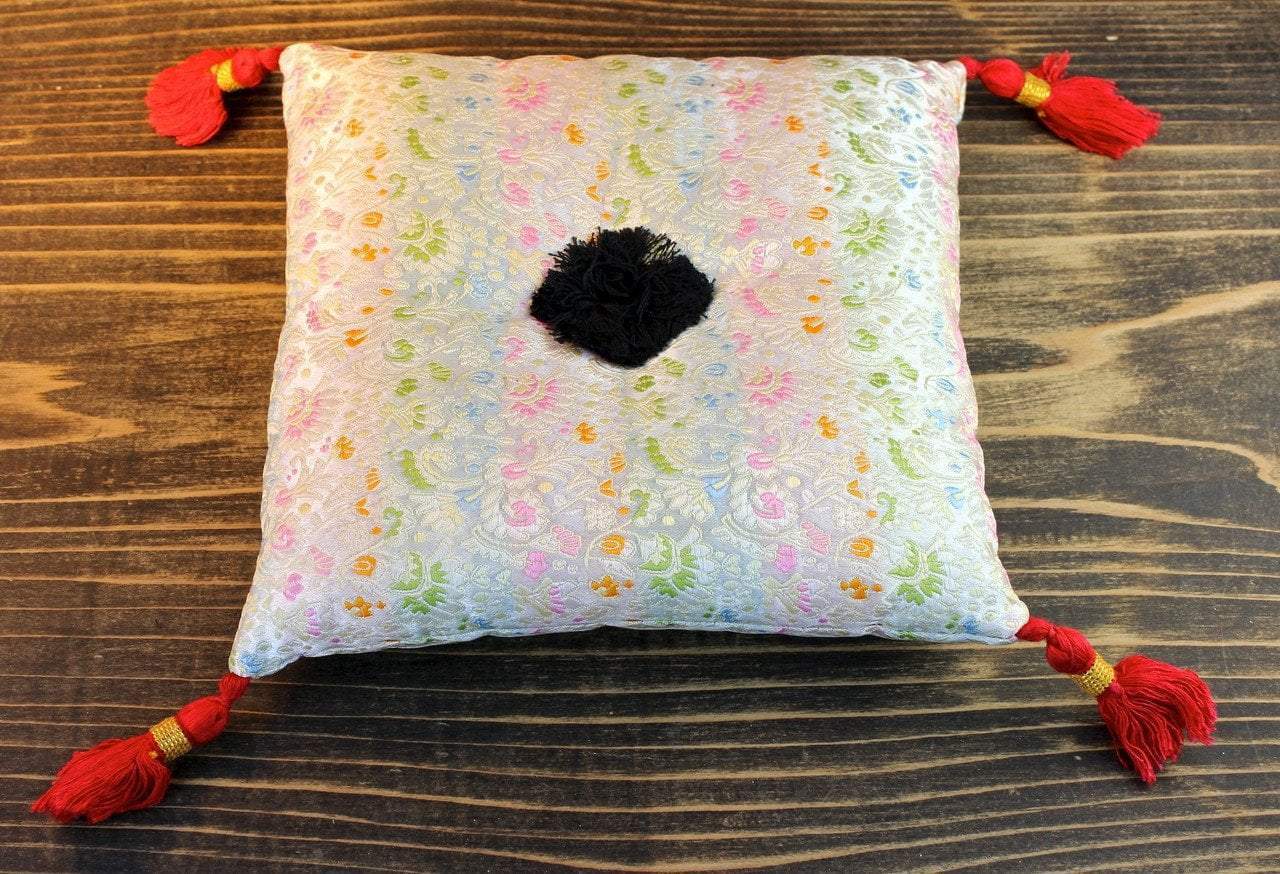 The perfect pillow for medium sized bowls. Handmade in Nepal. Pearly white in color with multicolor flowers and red tassels on each corner.