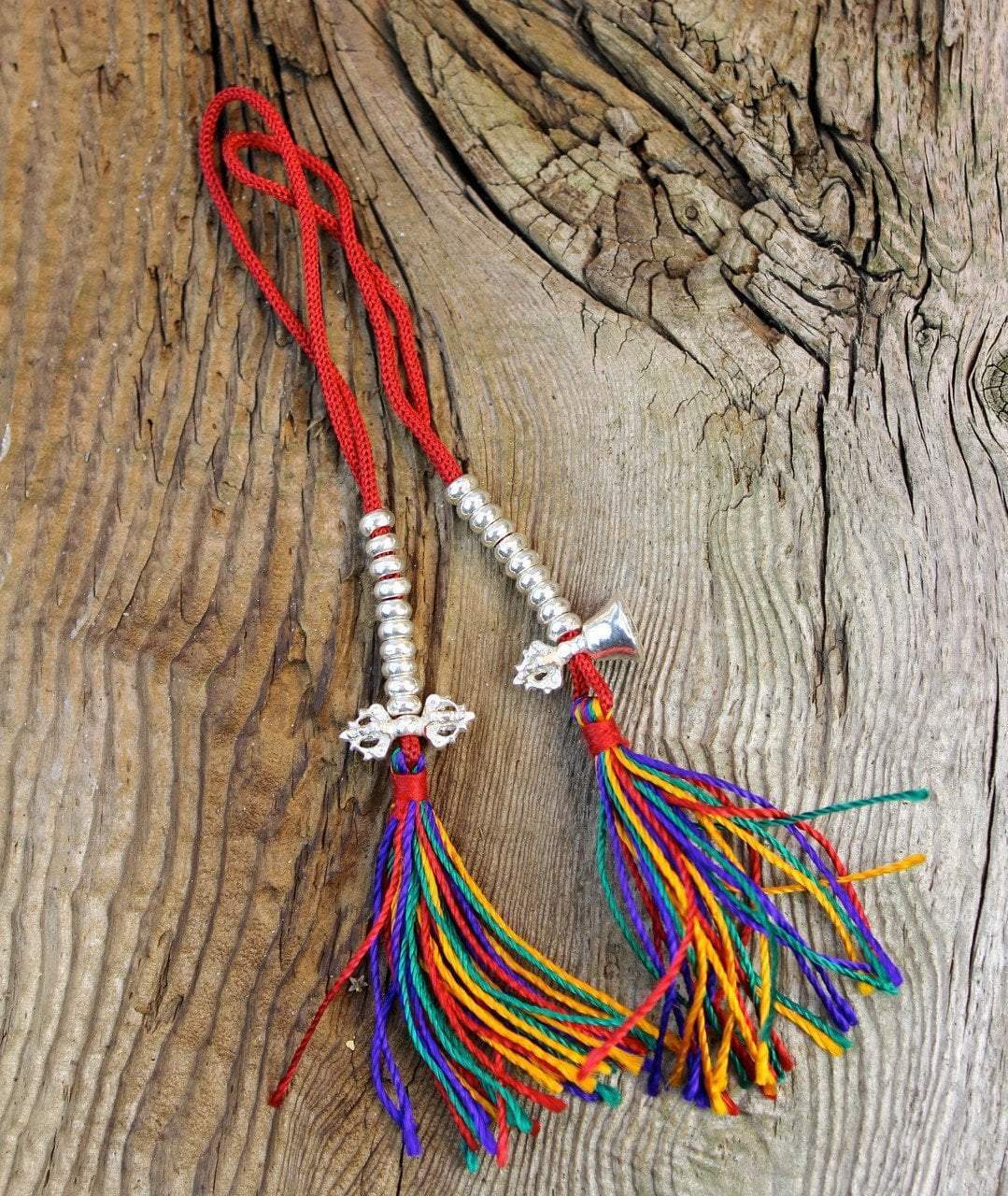 Beautiful white metal Tibetan mala counters. Feature a bell and dorje and can be added to a favorite or treasured mala. Strung on red cord and finished with colorful tassels.