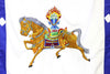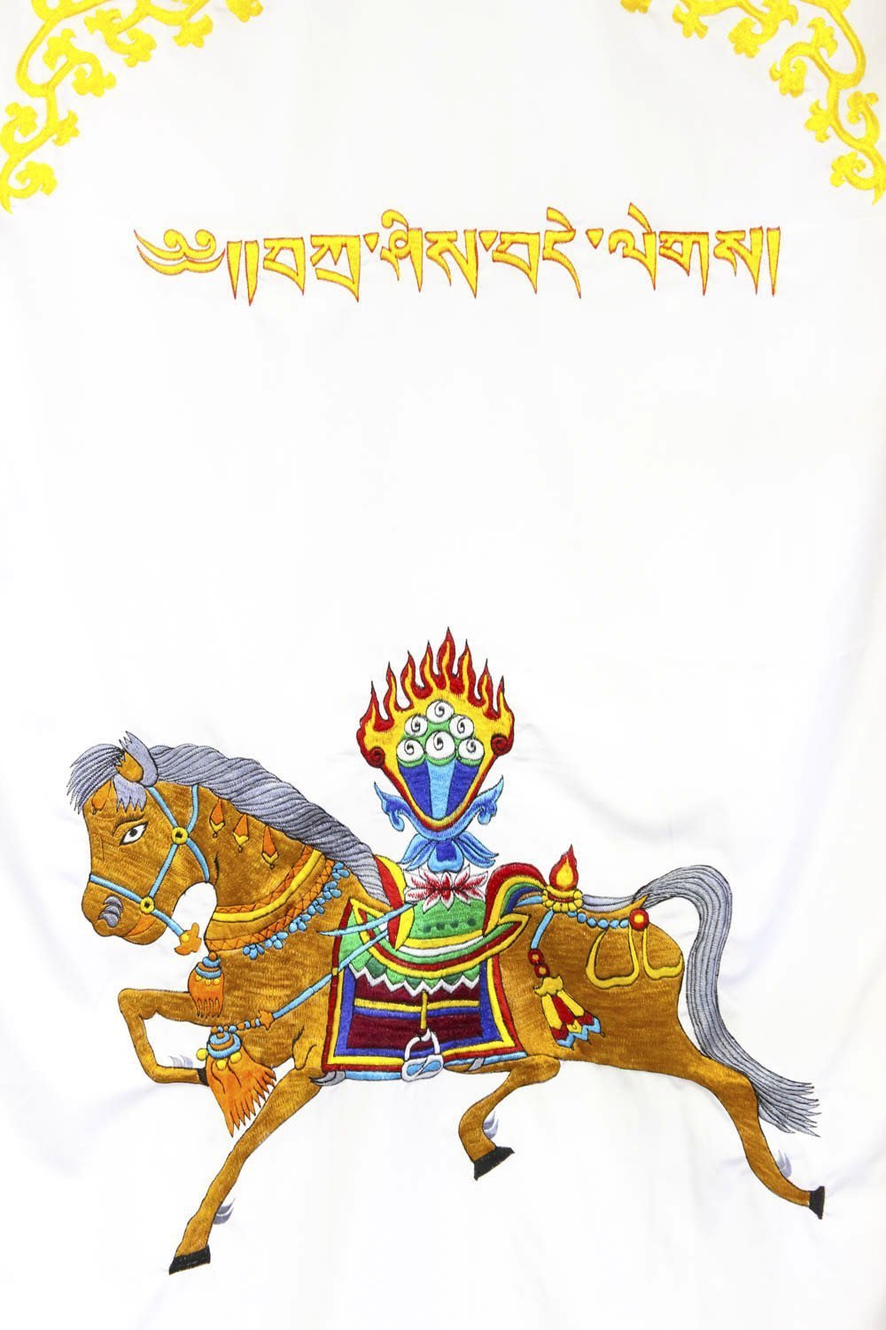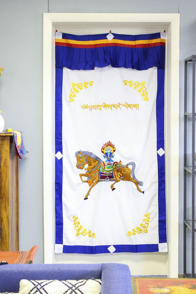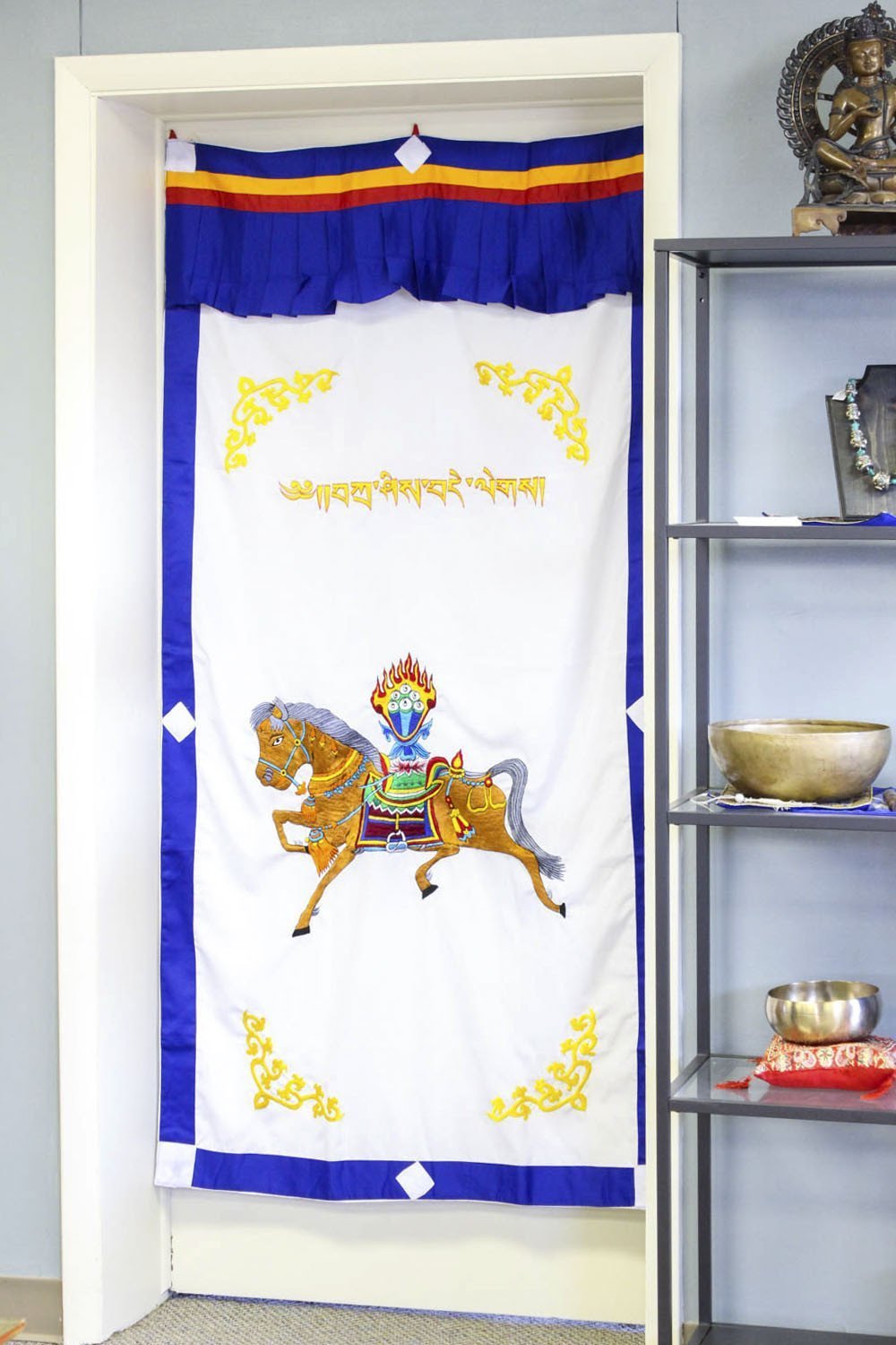 The Windhorse image, taken from Tibetan folk culture, symbolizes well being and good fortune. The mantra on the door curtain means, "Tashi Delek," which is a greeting and good luck symbol in Tibetan.