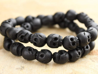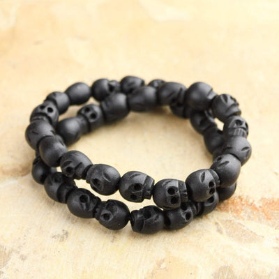 This wrist mala features unique handmade and hand carved black wooden skull beads strung on elastic cord to wrap two times around your wrist. The healing power of wooden prayer beads is often in their scent, which is released and revived with usage. Wood also provides stability and grounds mentally, physically, and spiritually.