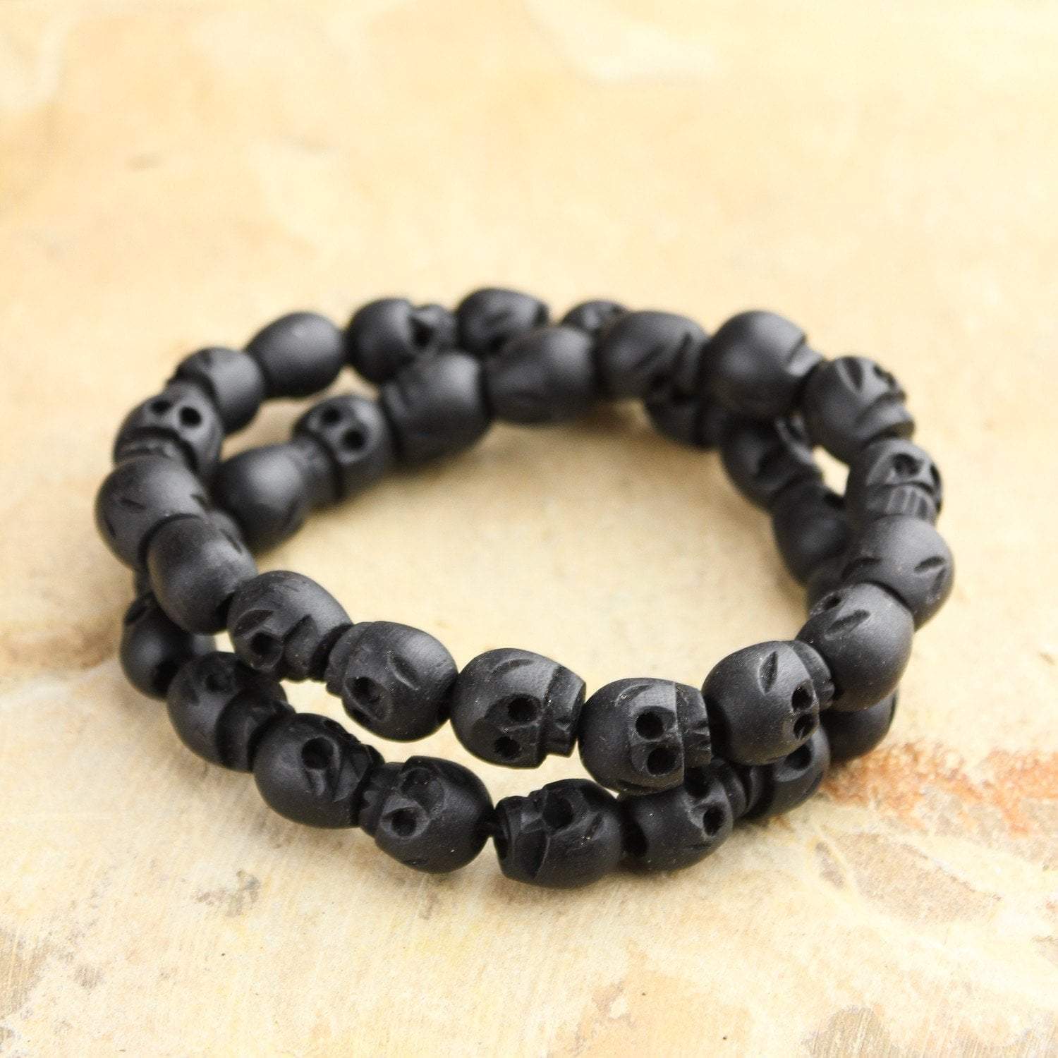 Bracelet measures approximately 17 inches around in total and is about 8 inches around when wrapped twice. Skull beads are 12-14mm. Made in India.
