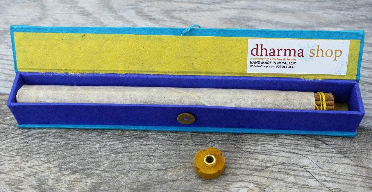 This incense is prepared by hand in accordance to the formula laid down by the ancient Tibetan doctors and medicinal texts. It is composed of 45 different herbal ingredients (including sandalwood and cedarwood) that have been used extensively for centuries in Tibet. It gives relief from headache and nausea caused by oxygen deficiency. It also gives relief from mental strain, stress, depression, insomnia, anxiety and back and chest pain. Has a fresh, calming aroma to aid in relaxation.