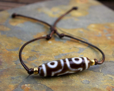 Made on vegan leather, this dZi bead bracelet with two gold vermeil beads is simple and stunning. Adjustable.