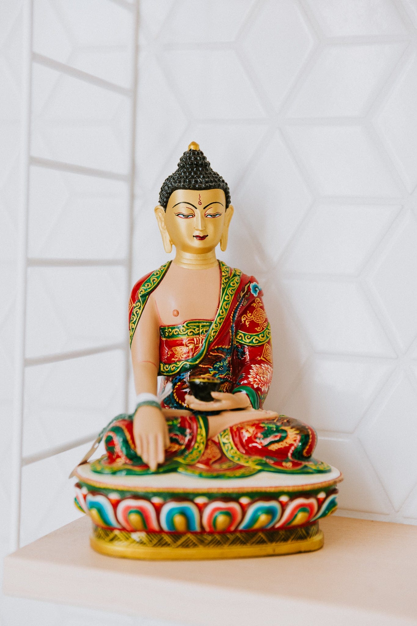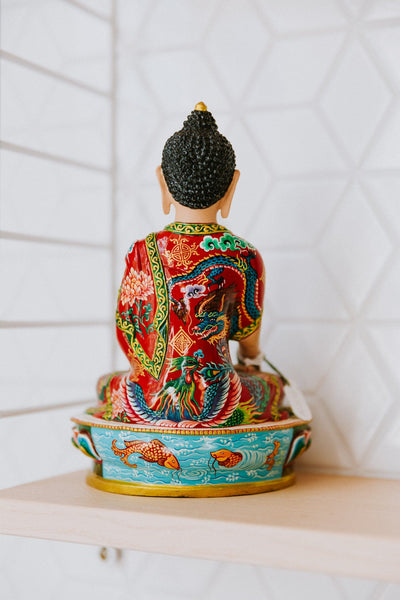 This statue is full of colorful painted detail including Tibetan dragons, lotus flowers, and swimming fish. Dragons have special meaning and symbolism in many cultures. They are fierce protectors and wise leaders, guardians and sages. Tibetan dragons are protectors of Buddhism whose thunderous voices awaken us from delusion. The face of the statue is painted with gold leaf in the traditional manner.