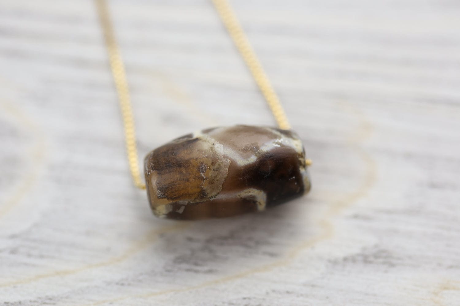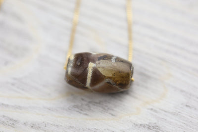Este Dzi es una antigüedad excepcional y única. El diseño de Double Diamond Eyes es bastante claro. La cuenta presenta algunas astillas y abolladuras junto con agujeros de forma irregular. Estas "imperfecciones" son las que hacen que esta cuenta sea tan increíblemente especial. La exquisita textura de esta cuenta muestra su rica historia y antigüedad. Estas marcas, la textura de la superficie y las bandas de ágata translúcidas son lo que las cuentas Dzi modernas se esfuerzan por emular, y aquí está en su forma antigua original.