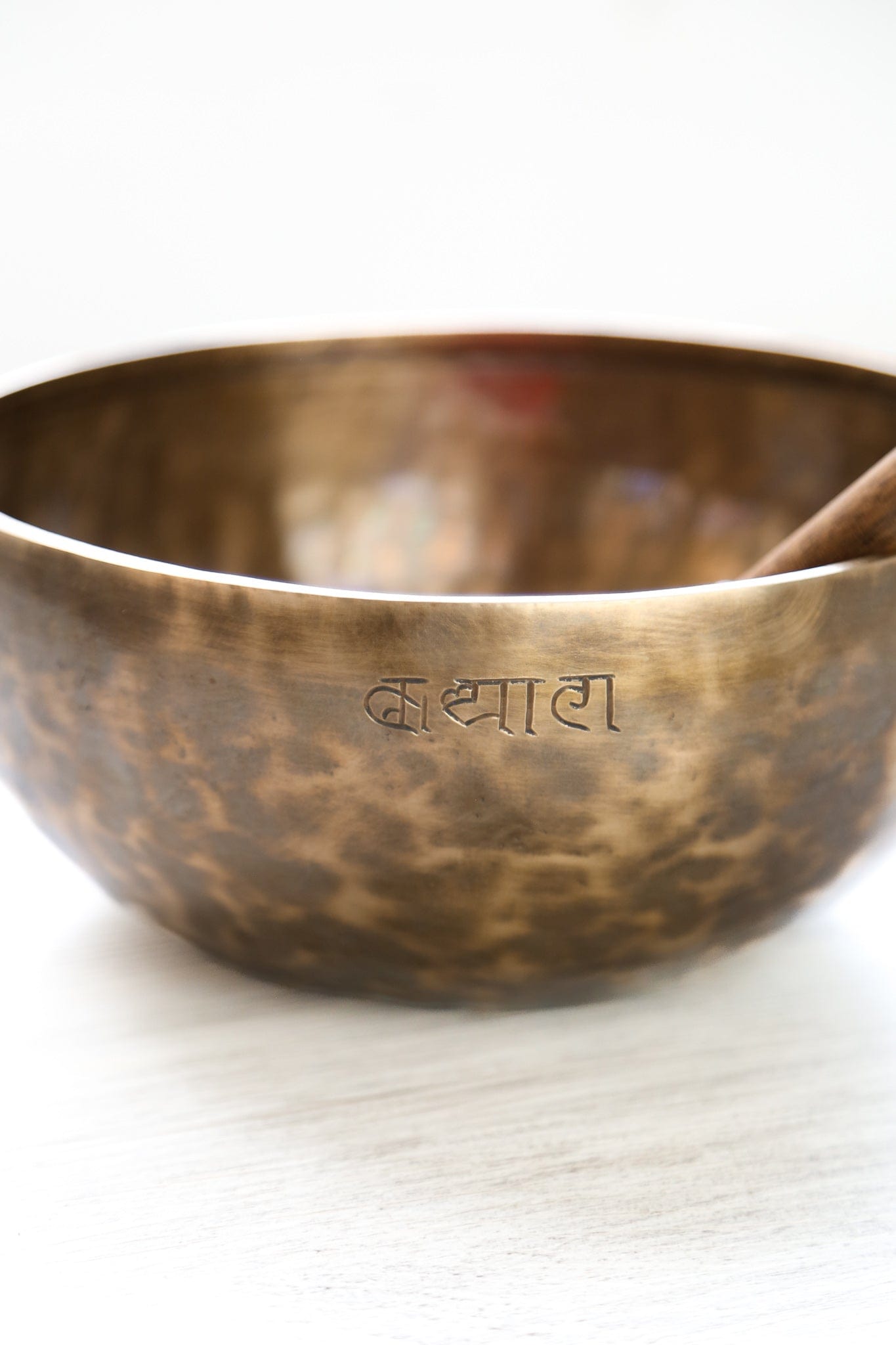 Each bowl features gorgeous hand carved details including an exclusive Full Moon Singing Bowl stamp and the mantra of compassion in Tibetan script. The mantra invokes the powerful benevolent attention and blessings of Chenrezig, the embodiment of compassion. The Full Moon Singing Bowl stamp is also known as a symbol of longevity and happiness.