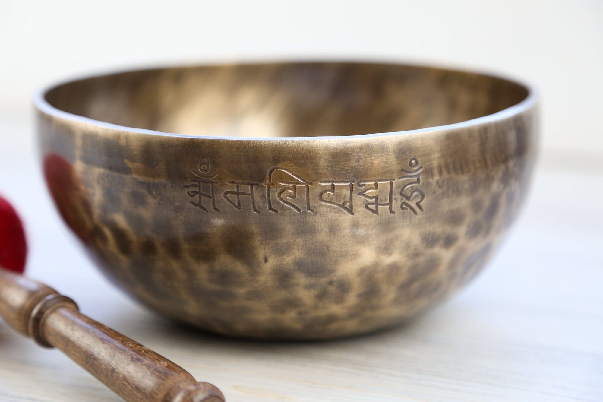 Each bowl features gorgeous hand carved details including an exclusive Full Moon Singing Bowl stamp, an original makers mark, and the mantra of compassion in Tibetan script. The mantra invokes the powerful benevolent attention and blessings of Chenrezig, the embodiment of compassion. The Full Moon Singing Bowl stamp is also known as a symbol of longevity and happiness.