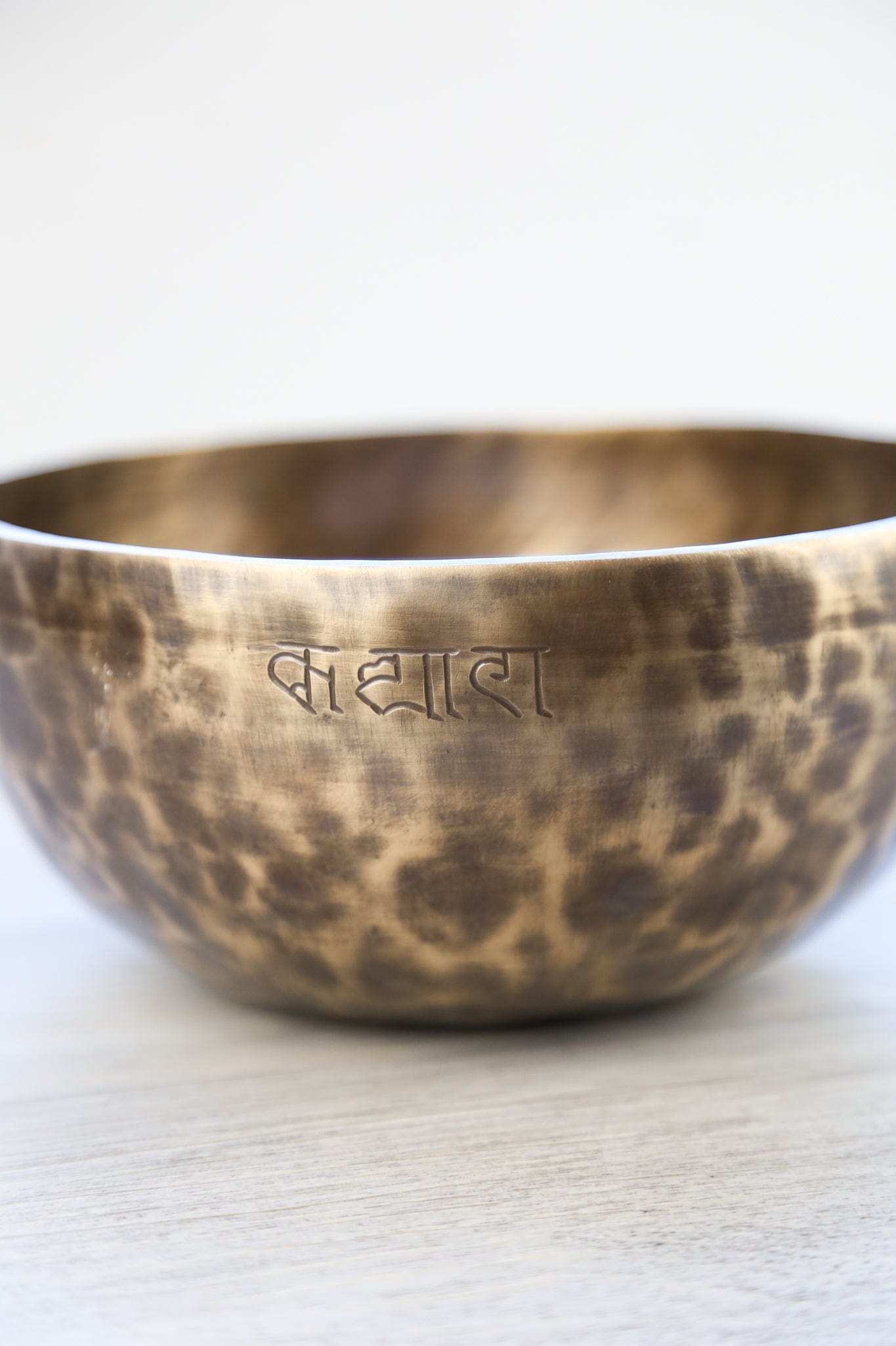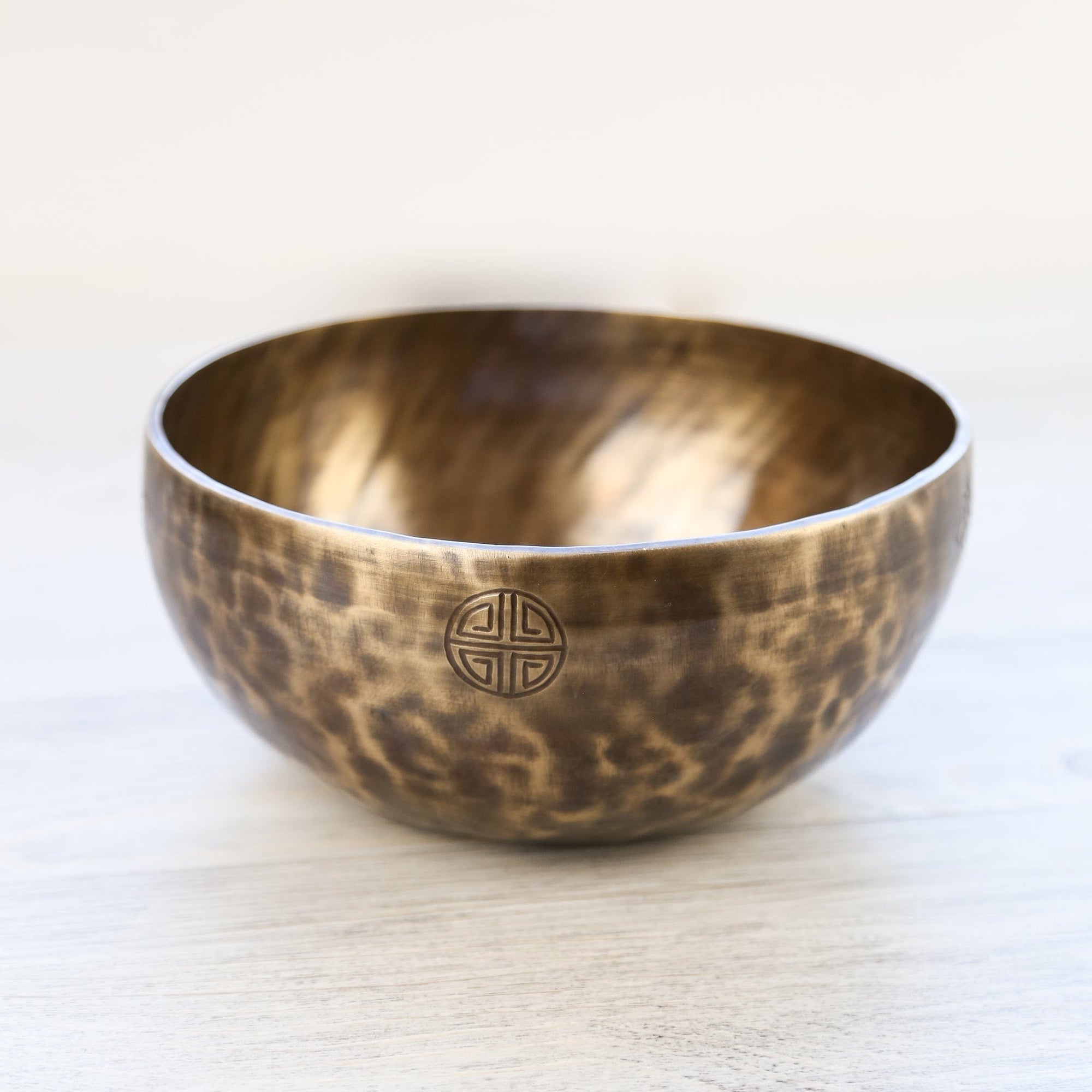 Each bowl features gorgeous hand carved details including an exclusive Full Moon Singing Bowl stamp, an original makers mark, and the mantra of compassion in Tibetan script. The mantra invokes the powerful benevolent attention and blessings of Chenrezig, the embodiment of compassion. The Full Moon Singing Bowl stamp is also known as a symbol of longevity and happiness.