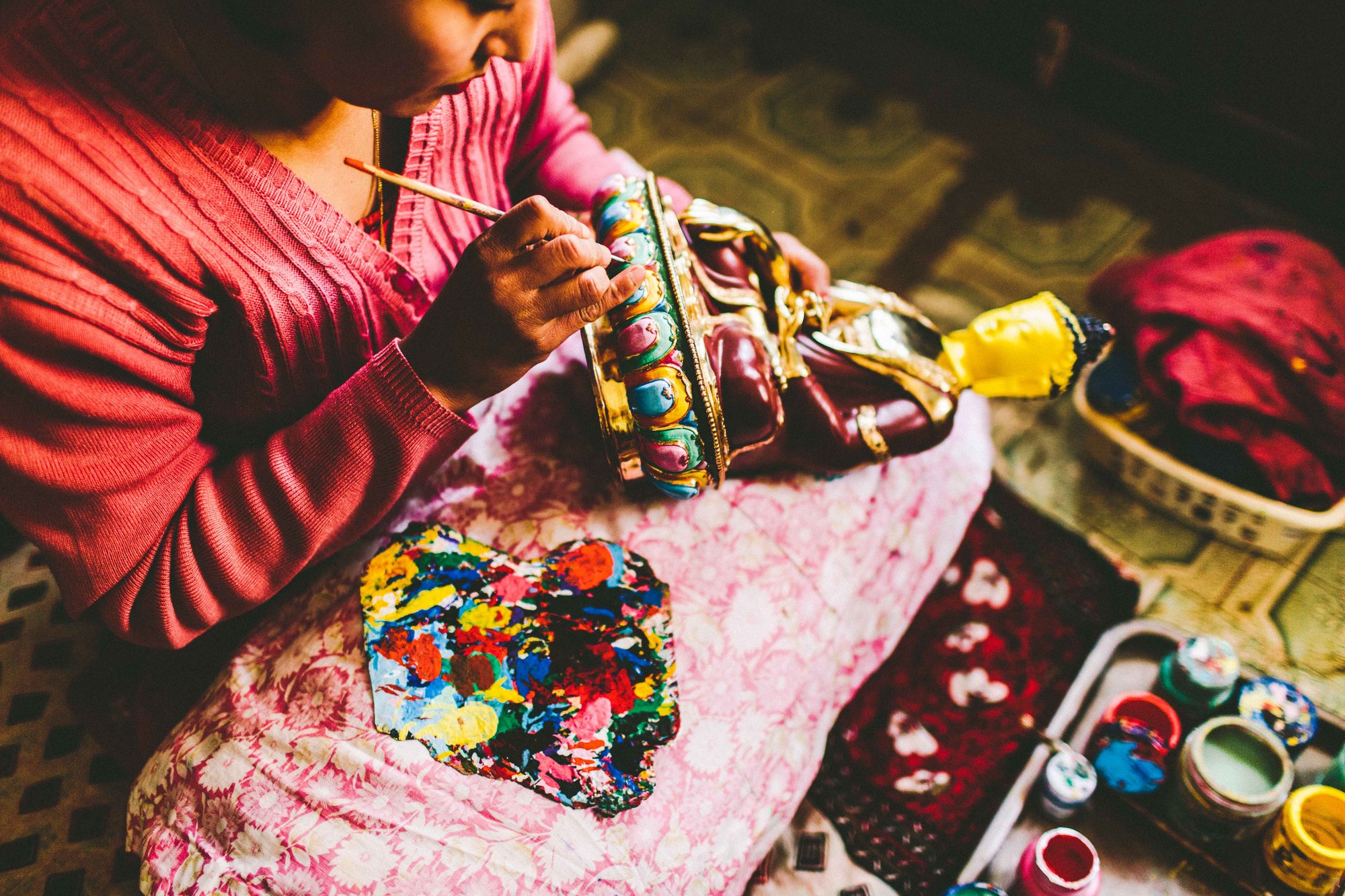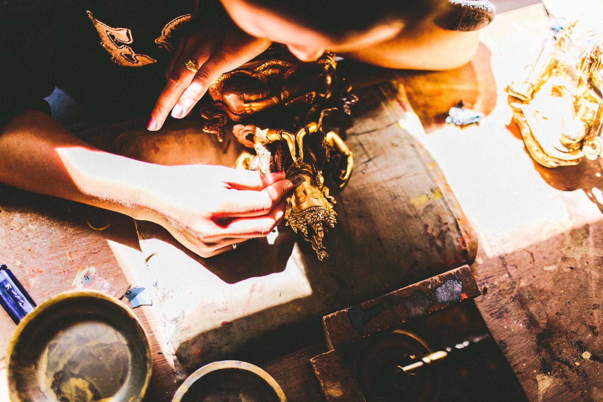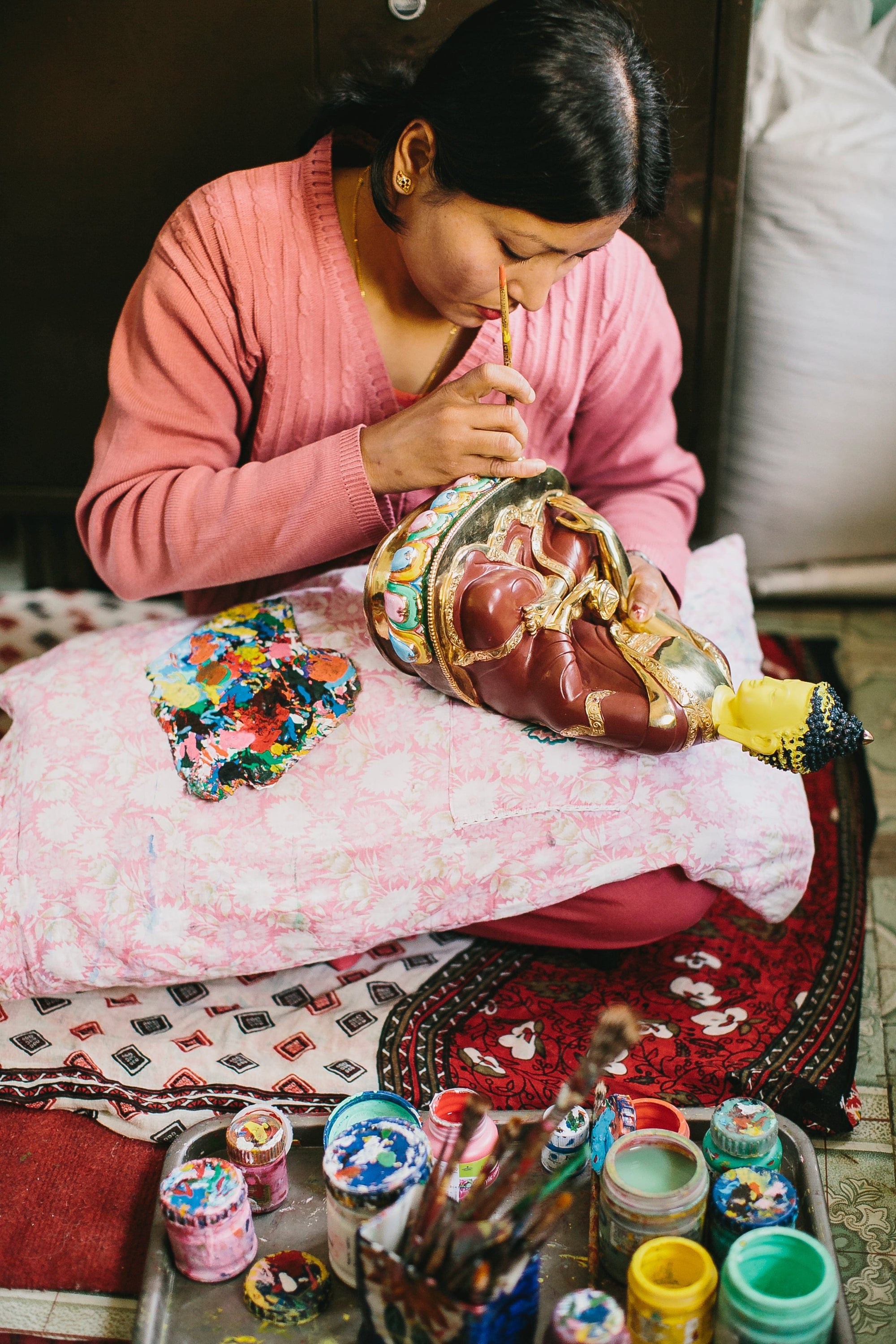 This Shakyamuni statue is carved entirely by hand, then cast using the lost wax method. Over eight artists work on carving, making wax molds, pouring hot bronze, and hand painting the gold faces and eyes on a statue like this. It takes Meenu Shakya herself months to complete a statue with such intricate hand painted details.