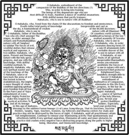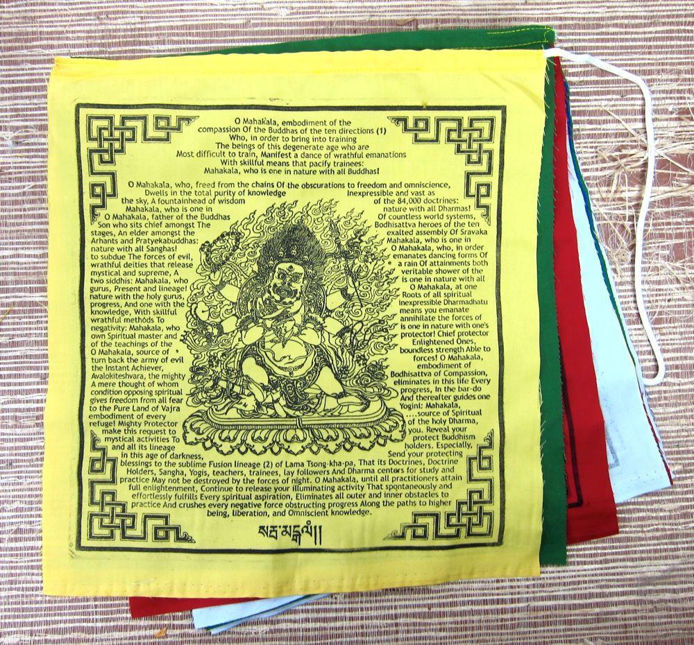 Estas hermosas y grandes banderas de oración presentan a Mahakala, uno de los feroces protectores del Tíbet. Teníamos este conjunto de banderas diseñado y fabricado exclusivamente para DharmaShop. Se cree que colgar esta bandera de oración protege a todos los seres y a su hogar de la negatividad. Oraciones en inglés rodean la imagen central del Mahakala.