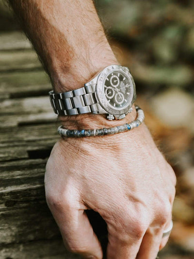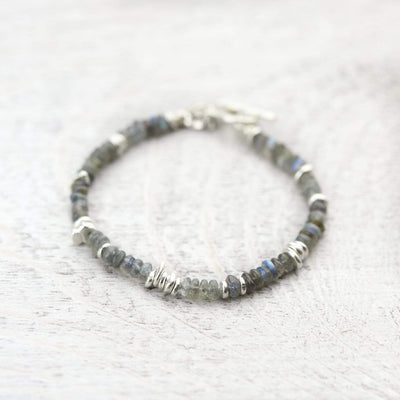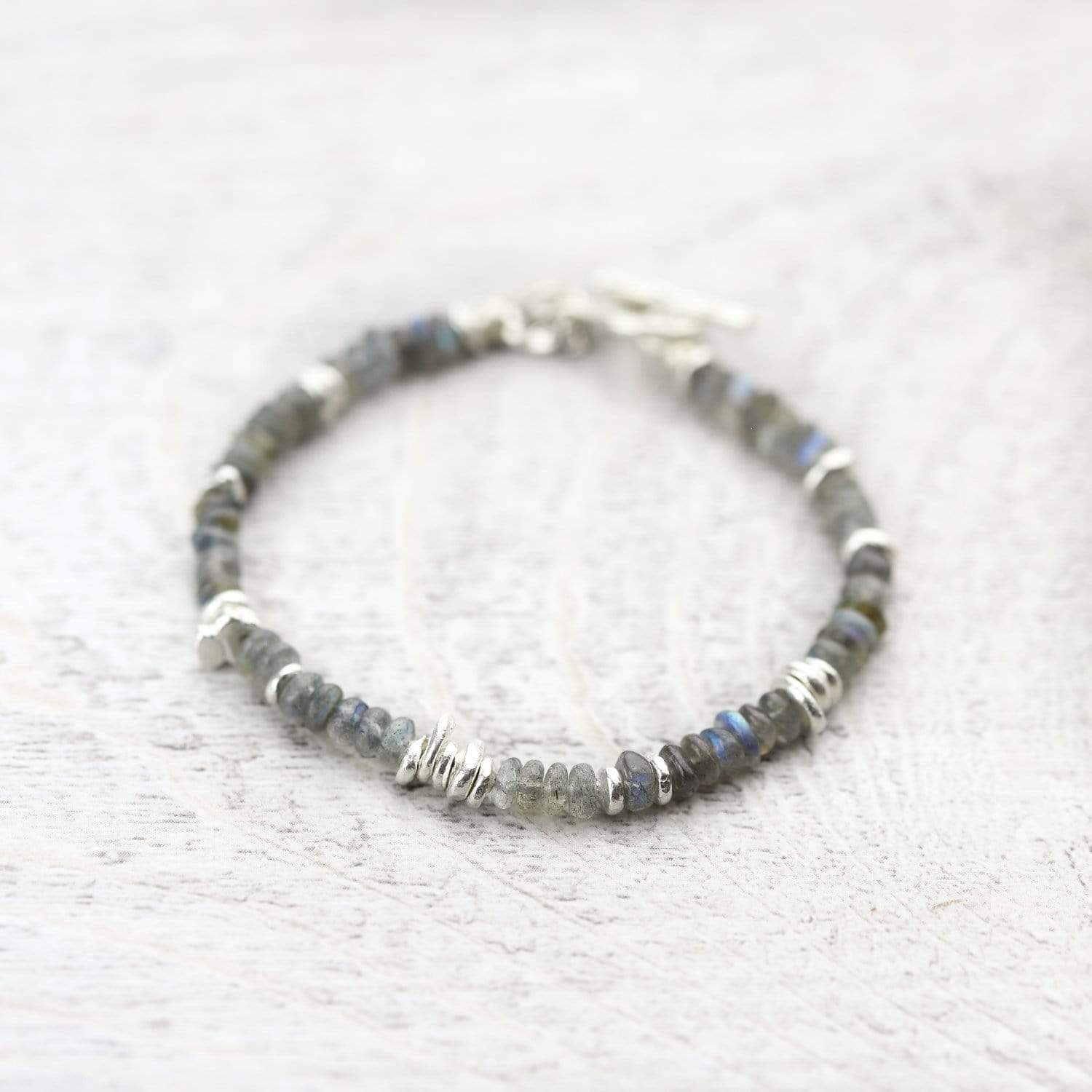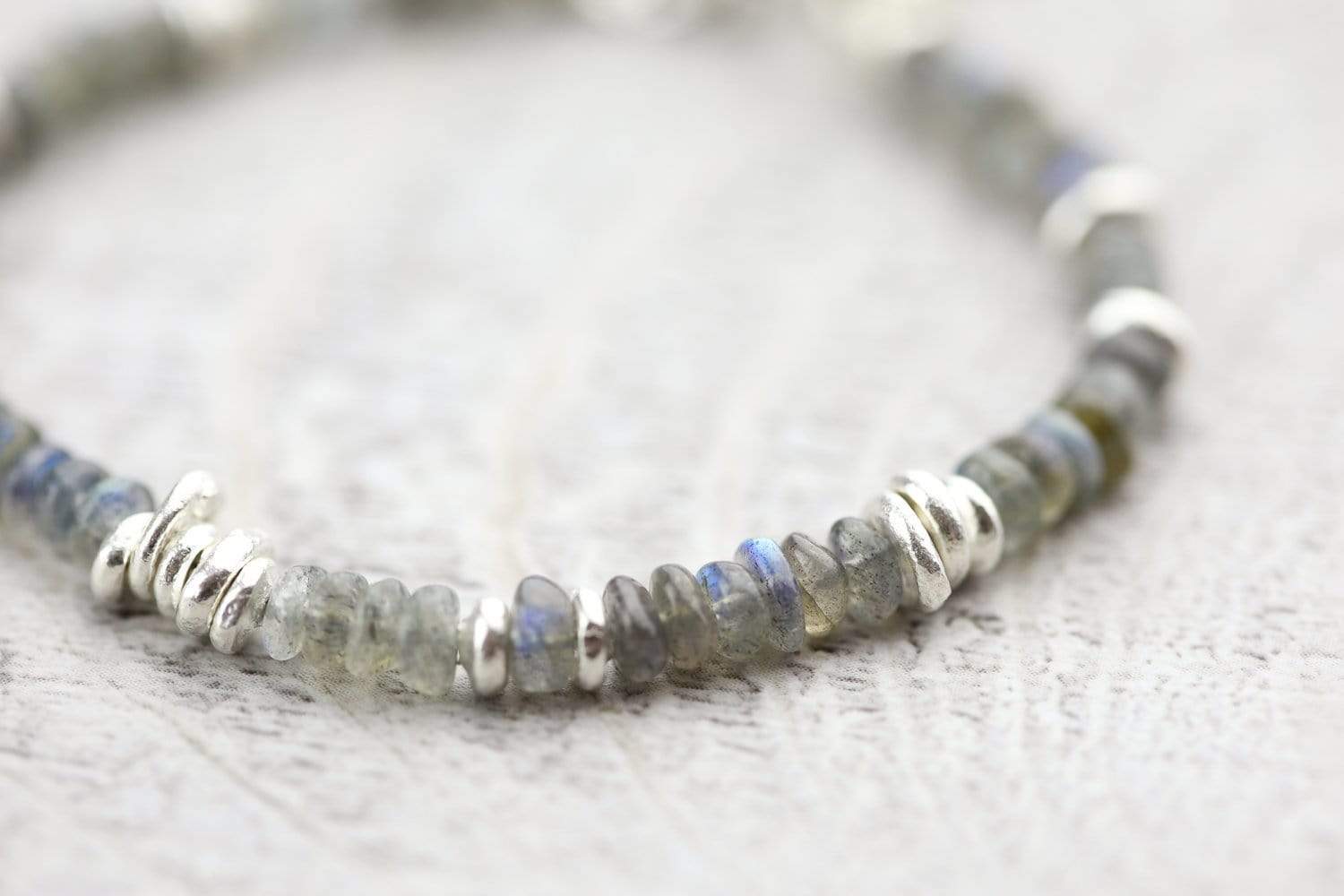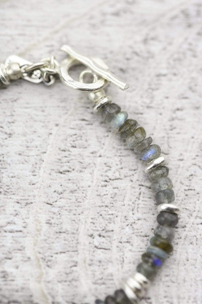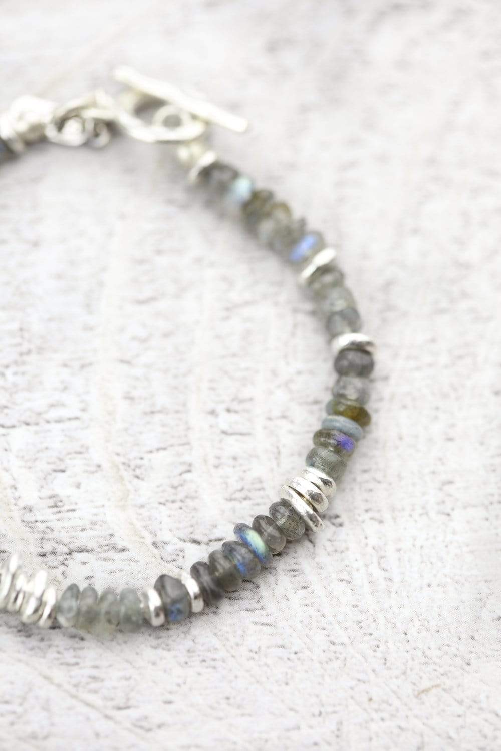 • Hecha a mano en Tailandia con una combinación de cuentas de plata 98% pura de las tribus de las colinas y preciosas piedras preciosas de labradorita, esta pulsera está ensartada en alambre de plata con un cierre de palanca de plata martillado a mano para cerrar.