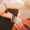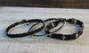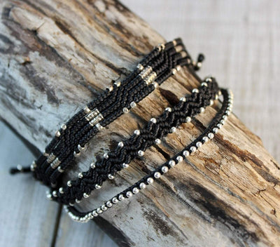 Tres pulseras apilables. Cordón negro tejido a mano con cuentas plateadas Hill Tribe en las tres pulseras. Tanto hombres como mujeres pueden disfrutar de este juego de pulseras.