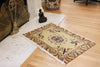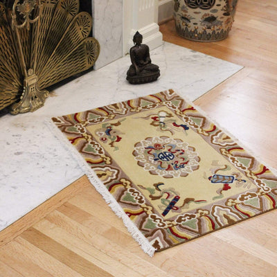 La alfombra mide aproximadamente 2' por 3'. Hecho a mano en Nepal.