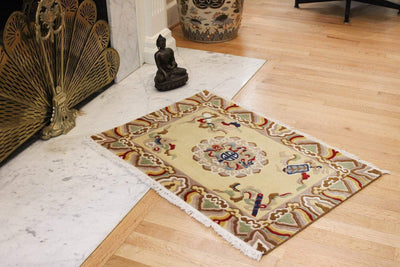 Esta alfombra de lana tibetana es el complemento perfecto para su hogar, oficina o espacio de meditación, ya que durará generaciones. Puedes agregar un cojín y sentarte sobre él durante la práctica de la meditación, o usarlo como un elegante tapete para la cocina o la puerta. ¡Esta hermosa alfombra tibetana tradicional presenta un diseño estilo mandala en el centro que es una maravillosa adición a cualquier hogar o sala de meditación!