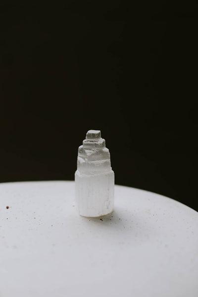 La torre de selenita mide aproximadamente 3-3,25 pulgadas de alto. *La selenita es un cristal suave con fibras naturales longitudinales que a veces pueden desprenderse; manipule con cuidado.*