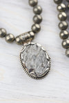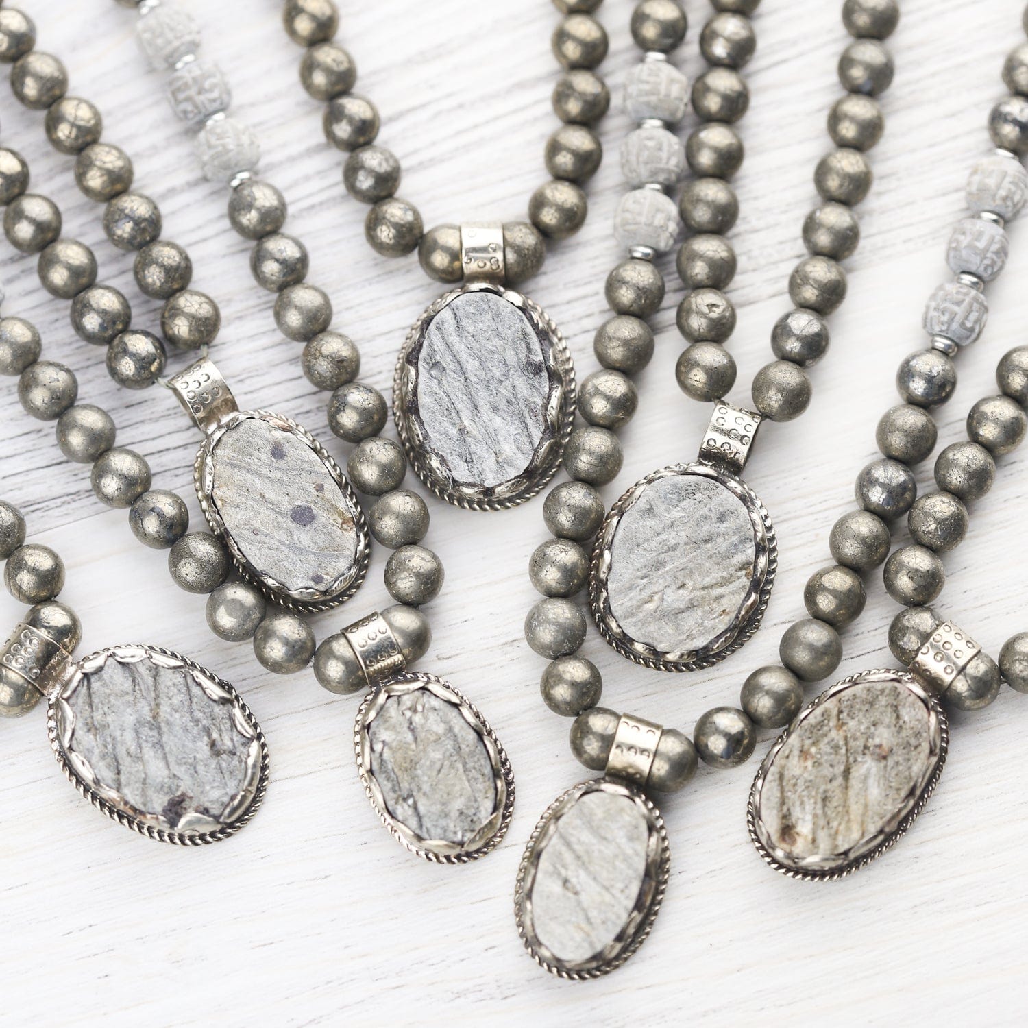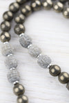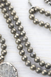 Crafted in Nepal, each pendant features a unique Pyrite stone with its own mesmerizing characteristics, making your mala one-of-a-kind. Associated with grounding and protection, Pyrite fosters a sense of security and strength while stimulating creativity and willpower.
